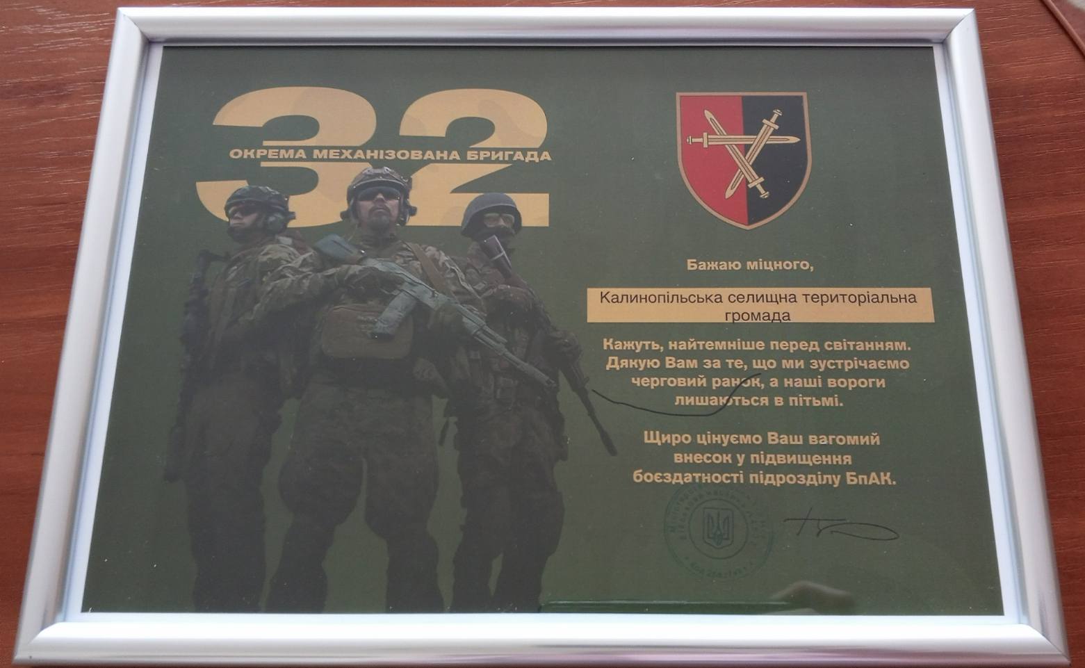 🇺🇦Калинопільська селищна територіальна громада отримала подяку від військовослужбовців 32-ї окремої механізованої бригади Збройних Сил України, у якій проходить службу наш земляк із Калинополя — Роман Слободяник.
