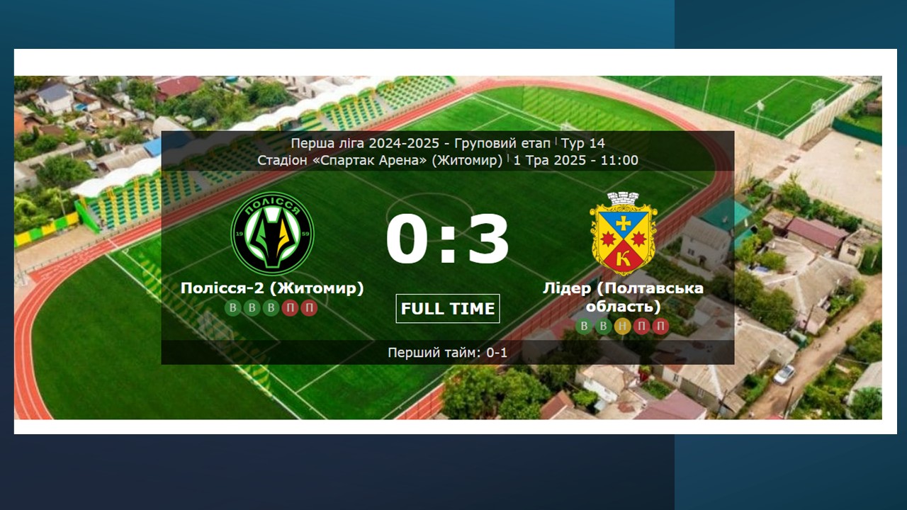 1 травня 2025 року в місті Житомир відбувся завершальний, 14-й тур другого кола Чемпіонату України з футболу серед жіночих команд Першої ліги, група «Б» сезону 2024–2025 років. У цьому матчі місцева команда «Полісся-2» приймала «Лідер» з Кобеляк.