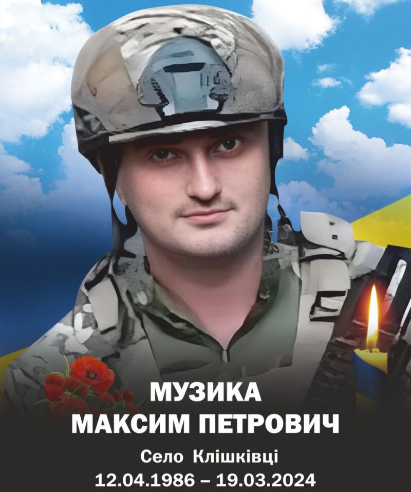 Історія життя та подвигу Максима Петровича Музики, уродженця села Клішківці Чернівецької області, який віддав життя за свободу України. Максим Петрович Музика народився 12 квітня 1986 року в родині Петра Сергійовича та Ганни Степанівни Музиків у мальовничому селі Клішківці Хотинського (нині Дністровського) району Чернівецької області. З дитинства він був оточений любов’ю та турботою. Його батько, Петро Сергійович, навчив його грати в шахи та їздити на велосипеді, розвиваючи в синові аналітичне мислення та любов до активного способу життя. Максим мав чудовий музичний слух і опанував гру на баяні в музичній школі, що свідчить про його різнобічні таланти. Рідні з теплотою згадують його дитячі роки, сповнені радості від подорожей та щирої любові до рідного краю. Його вигук: «Клішківчики мої, Клішківчики!» — лунав з радістю після кожної поїздки, підкреслюючи глибокий зв’язок із селом та близькими. Тітка Олена згадує про його лідерські якості вже змалку: навіть у дитячому садку він наполягав на своєму імені «Максим Петрович», демонструючи впевненість та самостійність. Однокласники та класна керівниця Параска Федорівна Мороз пригадують його як здібного, вихованого, слухняного та завжди усміхненого учня Клішковецької гімназії. Максим навчався до 7-го класу, після чого продовжив освіту в Києві, ставши випускником столичної школи та згодом — Київського національного економічного університету імені Вадима Гетьмана. Попри навчання та проживання в столиці, він щоліта приїжджав до рідних Клішківців, допомагав по господарству, цінував і поважав родину. Працюючи в Києві та Чернівцях, Максим разом з батьком збудував дім на обійсті дідуся і бабусі, мріючи повернутися до рідного села. Та трагічна війна перекреслила ці плани. Максима Музику мобілізували 8 квітня 2022 року. Маючи досвід служби в армії у танкових військах, він без вагань став на захист України. Його мотивував приклад батька, який у 1986 році був ліквідатором аварії на ЧАЕС, боровся з невидимим ворогом. Максим розумів, що цього разу ворог видимий, і прагнув докласти всіх зусиль для захисту своєї домівки. Друзі та знайомі відзначали його впертість і наполегливість у досягненні мети, а також вміння мати власну, обґрунтовану думку. Протягом майже двох років служби, лише двічі отримавши відпустку, Максим Музика разом із побратимами цілодобово ніс службу на одному з напрямків поблизу кордону Сумщини. Востаннє він відвідував рідне село на Різдво, провівши кілька днів із близькими. Ці зустрічі були сповнені щирих розмов, він намагався приділити увагу кожному, наче залишаючи на згадку теплі моменти. Родина намагалася вмовити його залишитися, але Максим, відчуваючи відповідальність, відповів: «В одного з побратимів мама хворіє, в іншого – діти маленькі. Їм треба бути удома. А в мене все в порядку, повинен іти». Старший солдат Максим Музика, у складі військової частини А4069, був направлений на Донецький напрямок, де виконував обов’язки старшого стрільця-оператора. З березня 2024 року рідні втратили зв’язок із ним. Після численних спроб дізнатися про його долю, вони отримали сповіщення про те, що захисник вважається зниклим безвісти. На жаль, надія на диво не справдилася. 19 березня 2024 року Максим Музика загинув унаслідок артилерійського обстрілу та штурмових дій противника поблизу с. Терни 