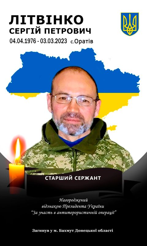Третього березня відзначаються треті роковини світлої пам’яті нашого земляка, Героя Сергія Петровича Літвінка (04.04.1976-03.03.2023). Сергій Петрович походив із села Оратів, але його життєвий шлях розпочався у Вінниці. З раннього дитинства, з дворічного віку, його домом стало село Оратів, де він здобув освіту та знайшов своє покликання.