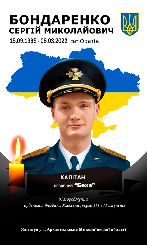 6 березня – день вшанування пам’яті Героя, військового льотчика БОНДАРЕНКА Сергія Миколайовича (15.09.1995-06.03.2022). Чотири роки тому, захищаючи Україну, він здійснив свій останній політ у безсмертя. Народився Сергій у селищі Оратів, у родині ветеринарного лікаря Миколи Валентиновича та вчительки Марії Петрівни Бондаренків. Невдовзі родина переїхала до міста Липовець, де минуло шкільне дитинство майбутнього героя. З дитячих мрій стати льотчиком, юнак із відзнакою закінчив Одеський ліцей з посиленою військово-фізичною підготовкою, а згодом – Харківський національний університет Повітряних Сил імені Івана Кожедуба.