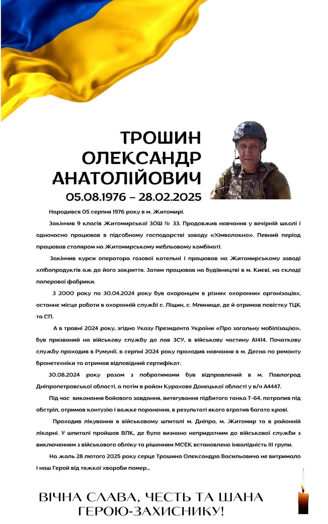 🇺🇦 Минає річниця, як пішов з життя після важкої хвороби наш земляк, учасник бойових дій, Трошин Олександр Анатолійович. Він народився 05.08.1976 року і відійшов у вічність 28.02.2025 року.