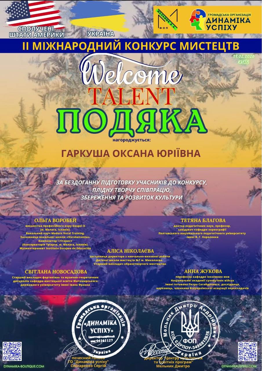 Мистецтво є універсальною мовою, що не знає кордонів, об’єднуючи країни, культури та людські серця. Це підтвердив ІІ Міжнародний конкурс мистецтв «WELCOME TALENT», який успішно зібрав талановитих учасників зі Сполучених Штатів Америки та України в єдиному творчому просторі. Особливо приємно відзначити значне досягнення учня Городищенської дитячої школи мистецтв ім. С.С. Гулака-Артемовського — Павла Телятникова. Він став лауреатом II премії ІІ Міжнародного конкурсу мистецтв “Welcome Talent”! 🌟