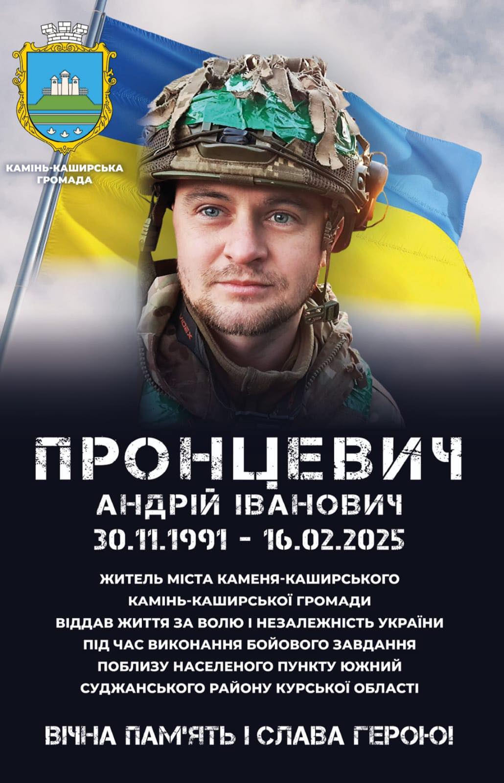 🪖 Герої не вмирають! Їхні подвиги, їхня самовідданість, їхня боротьба за вільну Україну назавжди залишаться в наших серцях і пам’яті прийдешніх поколінь. Ми мусимо пам’ятати кожного, хто віддав своє життя за Україну, щоб їхня жертва не була марною. Вічна пам’ять і слава Герою Андрію Пронцевичу!