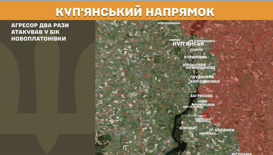 ▪️ На Куп’янському напрямку агресор два рази атакував у бік Новоплатонівки.