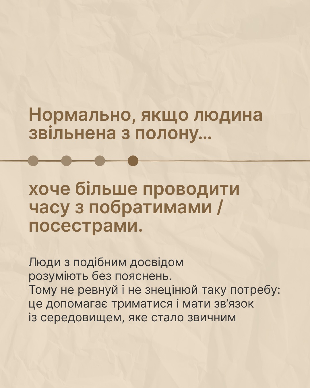 Процес повернення до нормального життя після полону надзвичайно складний. Звільнені герої несуть у собі не лише фізичні, а й глибокі психологічні рани. Тому критично важливо створити атмосферу довіри та безпеки, де вони зможуть поступово відновити зв’язок зі світом, який, можливо, здаватиметься їм чужим. Повага до їхнього вибору, темпу та емоційних станів є запорукою успішної адаптації. Важливо не тиснути, не нав’язувати свої очікування, а бути поруч, готовим вислухати, підтримати або просто бути мовчазним свідком їхнього шляху до відновлення. Реабілітація військових після полону – це марафон, а не спринт, і кожен крок вимагає уваги та емпатії.