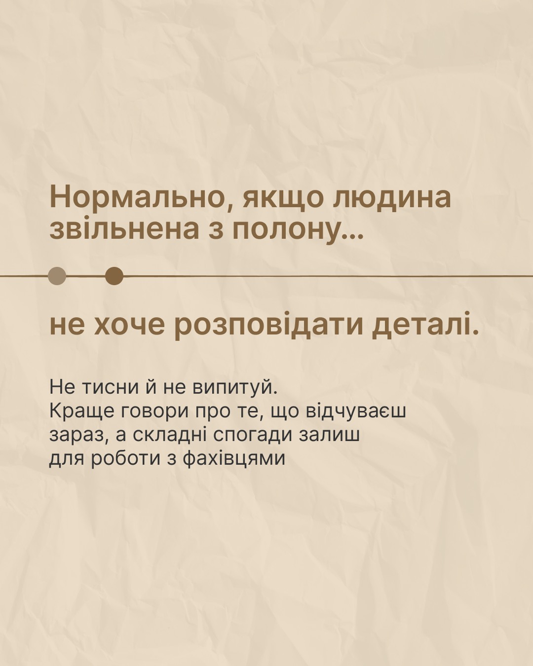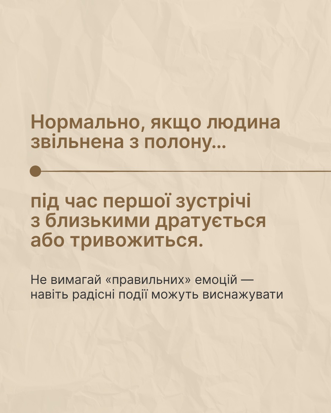 Повернення з полону – це випробування, яке вимагає глибокого розуміння та підтримки як для звільнених захисників, так і для їхніх близьких. Перша зустріч після тривалої розлуки може бути сповнена непередбачуваними емоціями. Важливо пам’ятати, що процес адаптації до звичного життя є індивідуальним і потребує часу, терпіння та безумовного прийняття. Дайте звільненому захиснику простір для висловлення своїх почуттів та реакцій, якими б вони не були. Ваша присутність, мовчазна чи розмовна, обійми чи збереження дистанції – все це має бути орієнтоване на його/її потреби та побажання. На платформі «Ти як?» існує ресурс, що допомагає краще зрозуміти, як надавати ефективну підтримку тим, хто пройшов через полон. Цей ресурс детально описує методи взаємодії та психологічні аспекти реабілітації.