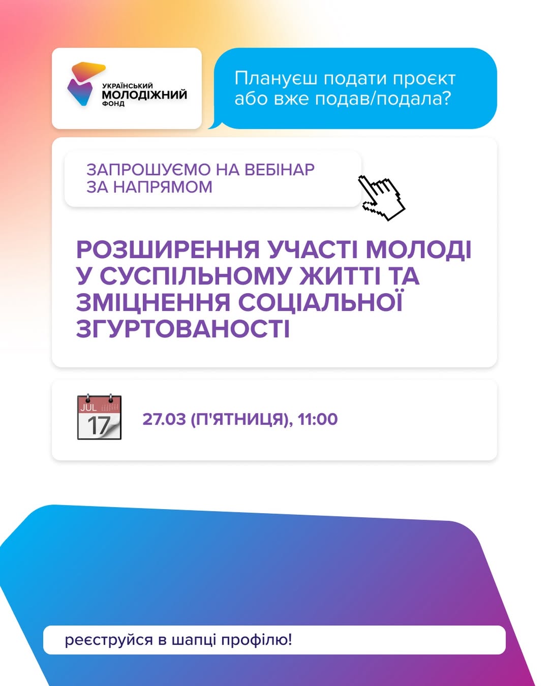 Плануєте подати проєкт або вже подали заявку? Дізнайтеся, як посилити свою пропозицію та уникнути втрати балів через дрібні помилки. Український молодіжний фонд (УМФ) запрошує на важливий вебінар, присвячений напрямку «Розширення участі молоді у суспільному житті та зміцнення соціальної згуртованості».