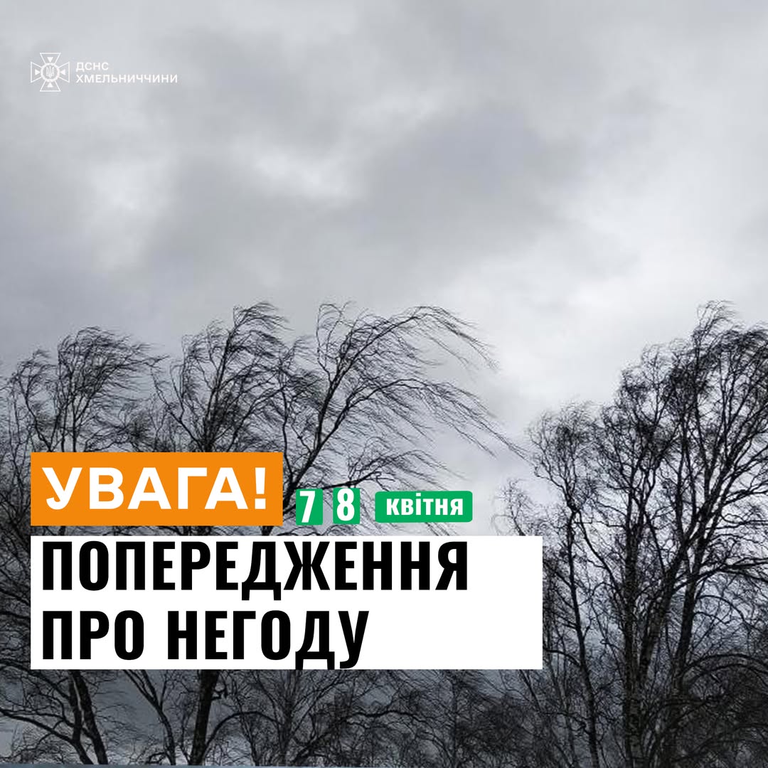 За інформацією Хмельницького обласного центру з гідрометеорології, 7–8 квітня на території області очікуються пориви вітру 15–20 м/с.