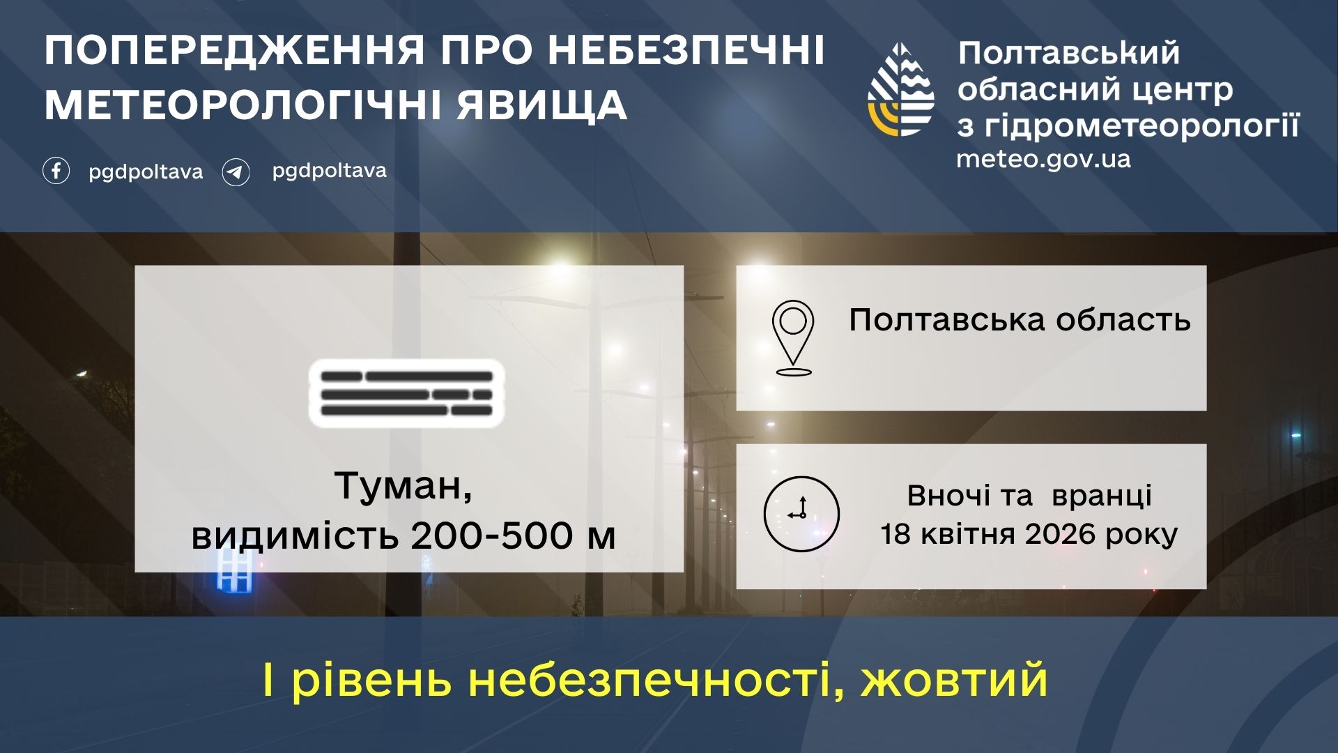 ℹ️ За інформацією Полтавського обласного центру з гідрометеорології вночі та вранці 18 квітня 2026 року по м.Полтава та Полтавській області туман, видимість 200-500 м.
