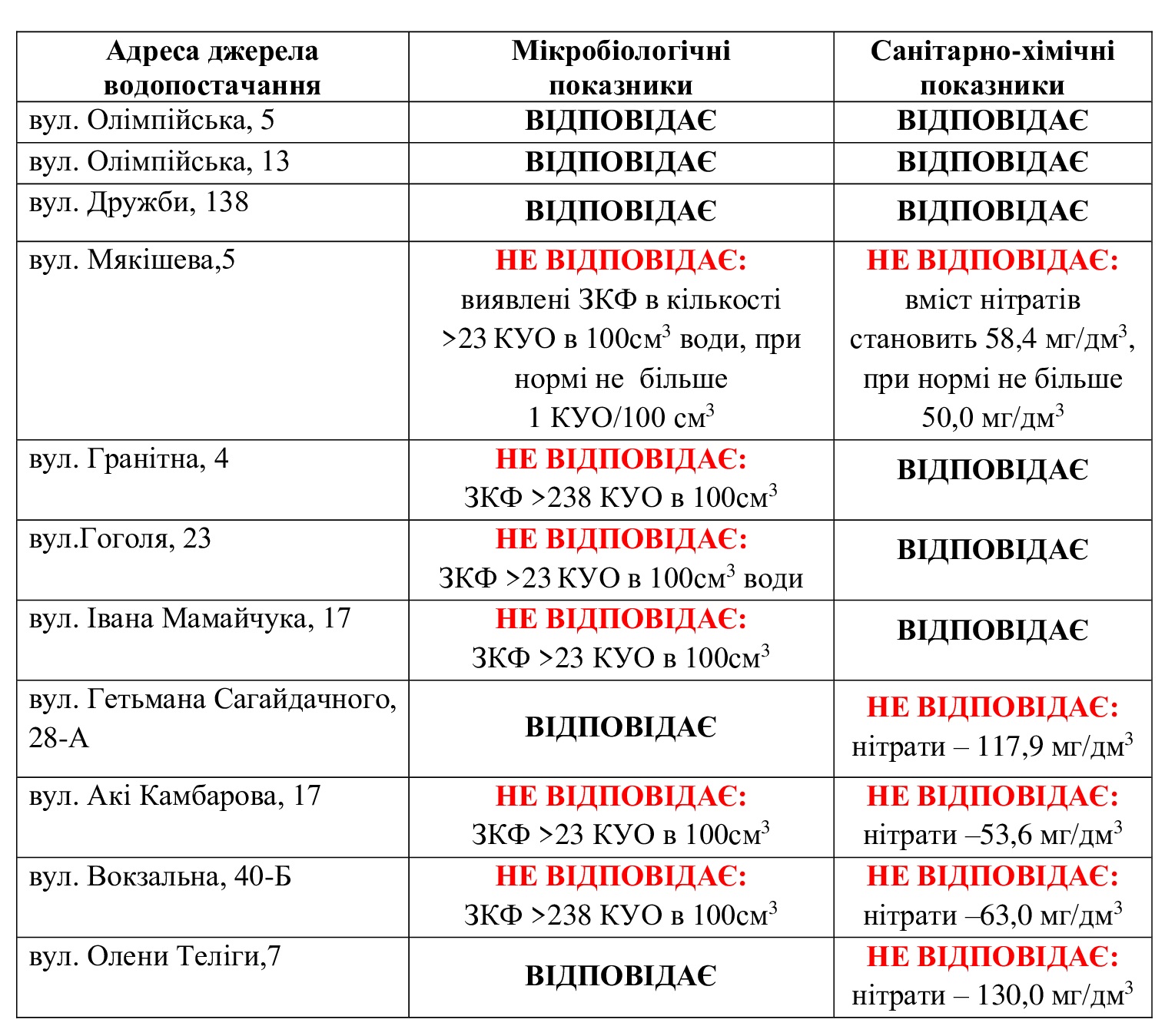 Особливо відзначено, що питна вода з громадських криниць, розташованих за такими адресами, повністю відповідає встановленим стандартам якості: