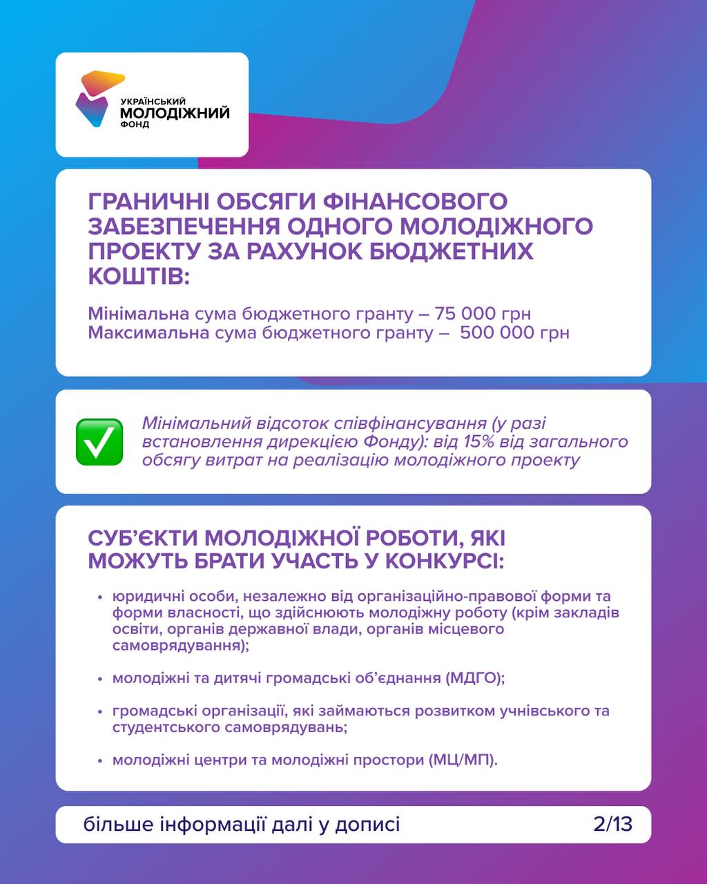 Від 75 000 до 500 000 грн. Можливе співфінансування від 15%, що стимулює партнерство та відповідальність.