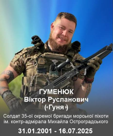 З глибоким сумом повідомляємо, що 16 липня 2025 року, поблизу села Новопавлівка, мужній воїн Віктор Гуменюк загинув, до останнього подиху захищаючи нашу землю від ворога. Його жертва не буде забута, а пам’ять про його подвиг житиме вічно.