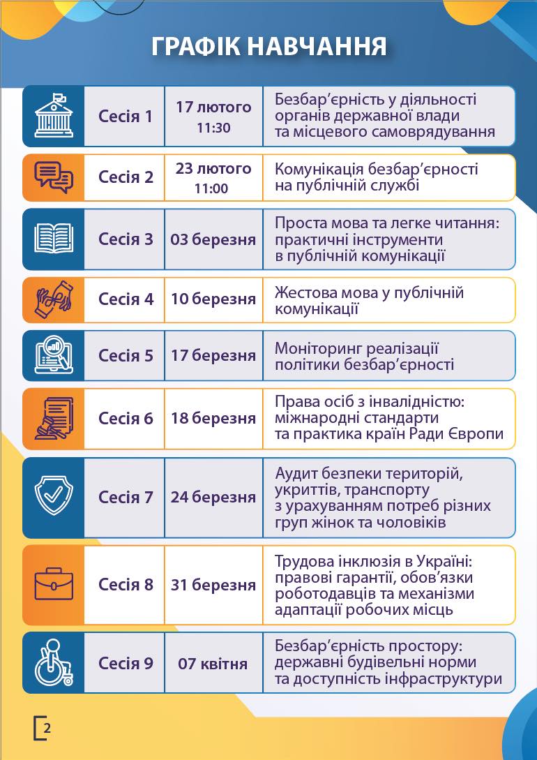 ☝️Марафон складається з 9 тематичних сесій, розроблених для формування у публічних службовців глибокого системного розуміння принципів та інструментів державної політики безбар’єрності. Особлива увага приділяється розвитку практичних навичок, необхідних для ефективного застосування цих знань у професійній діяльності на публічній службі. Це комплексна програма, спрямована на удосконалення роботи державних органів та підвищення якості послуг для громадян.