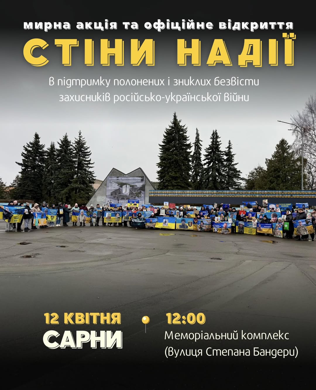 Запрошуємо мешканців та гостей міста Сарни долучитися до мирної акції та офіційного відкриття «Стіни Надії» — місце на честь наших полонених та зниклих безвісти захисників російсько-української війни.