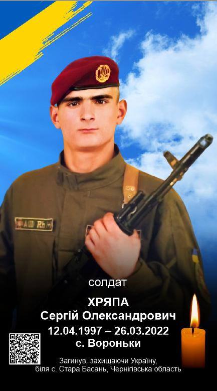 На жаль, 26 березня 2022 року, під час виконання свого військового обов’язку, Сергій Хряпа загинув у жорстокому бою в селі Стара Басань. Ця втрата стала непоправною для його родини, друзів та всієї громади. Йому було лише 24 роки… 🥀 Його життя, сповнене мрій та планів, обірвалося надто рано, але його подвиг назавжди залишиться в наших серцях.