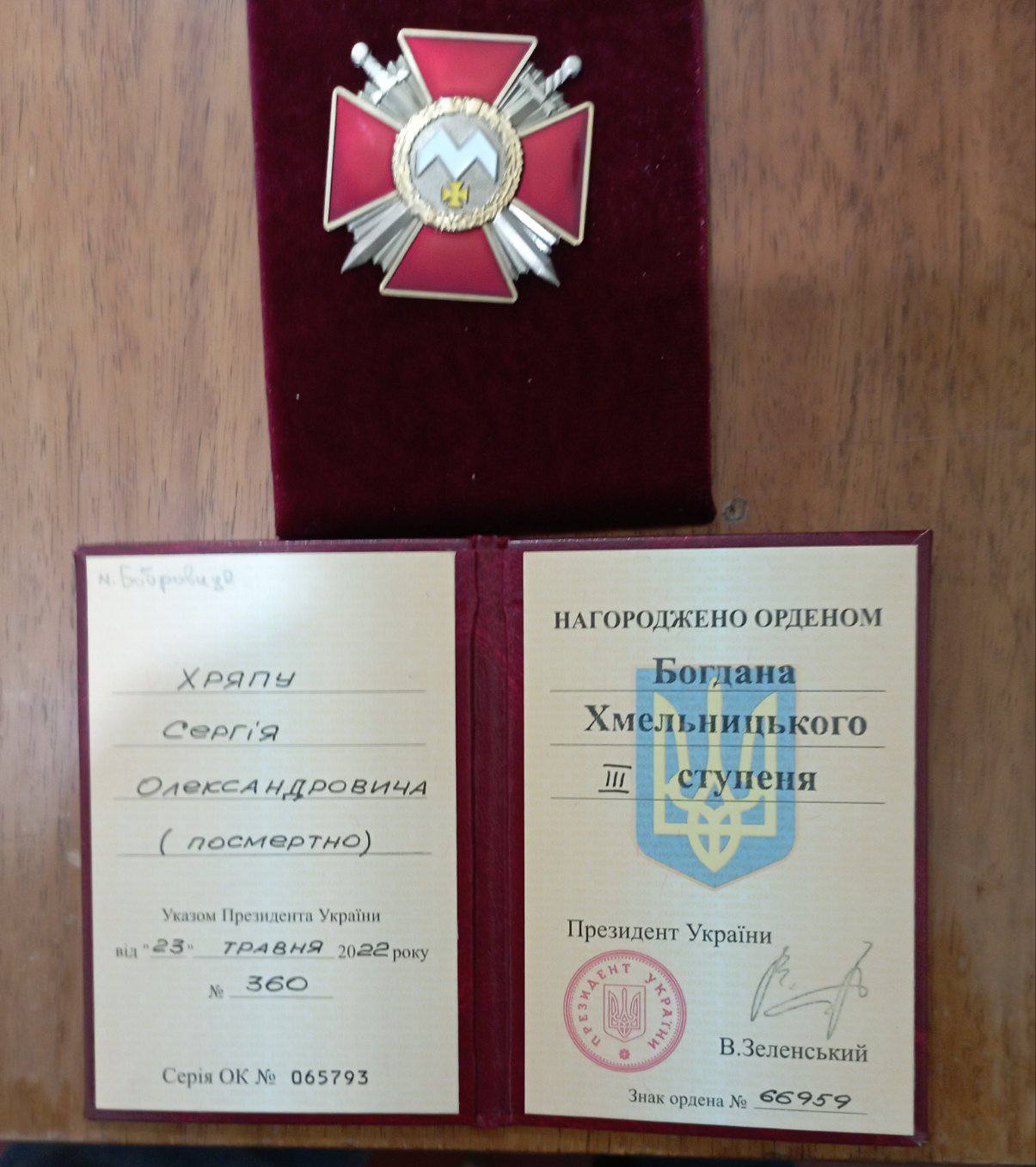 — Указом Президента України від 23 травня 2022 року Сергія Хряпу було посмертно нагороджено високою державною відзнакою — орденом Богдана Хмельницького ІІІ ступеня 🏅. Це визнання його виняткової мужності та самопожертви.