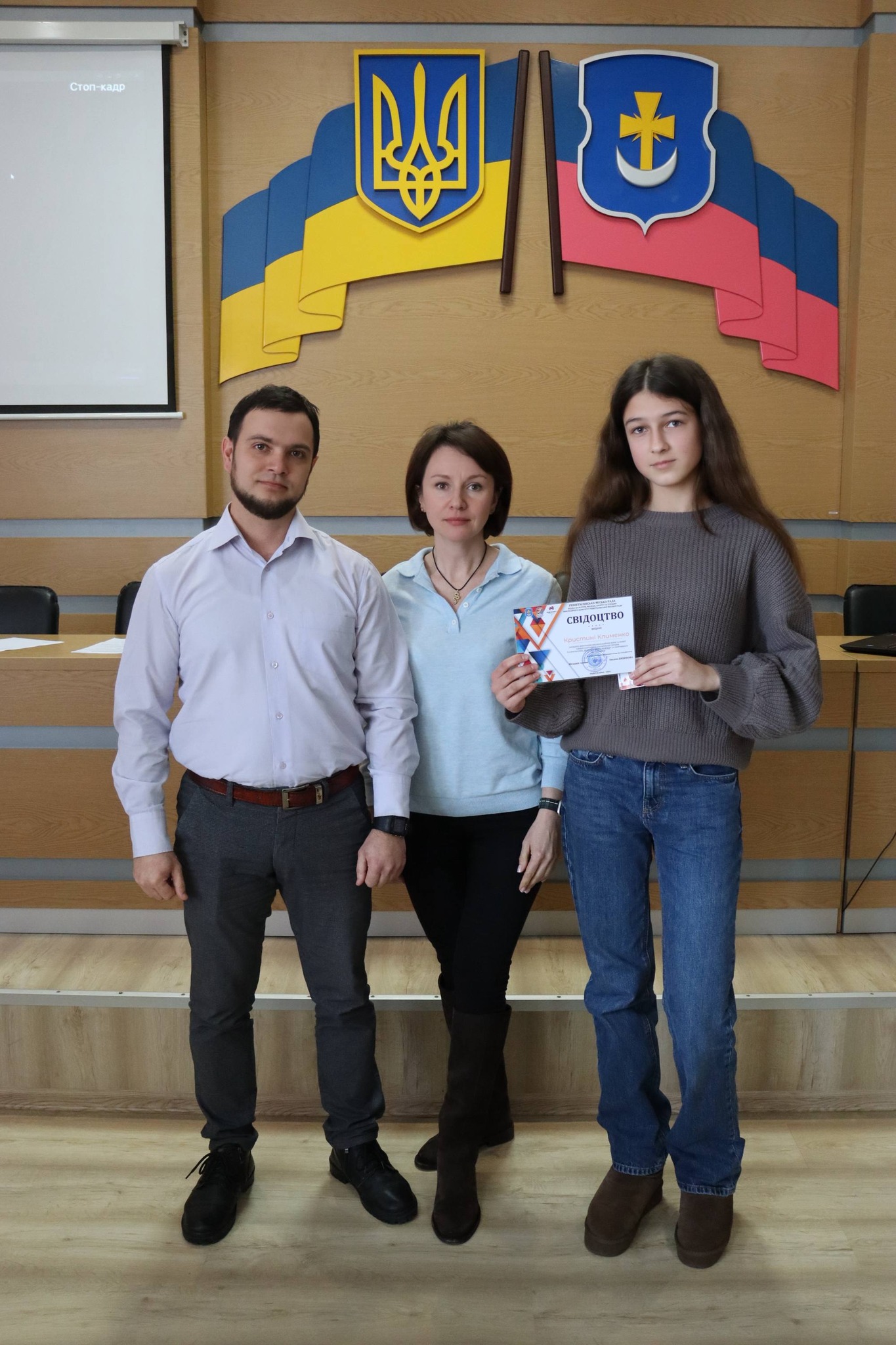Перед початком засідання сесії міський голова Оксана ДЯДЮНОВА вручила значок та свідоцтво про присвоєння ІІІ спортивного розряду зі спортивного орієнтування Кристині КЛИМЕНКО та подякувала її тренеру Віталію КИСЕЛЬОВУ за професійну підготовку юної спортсменки.