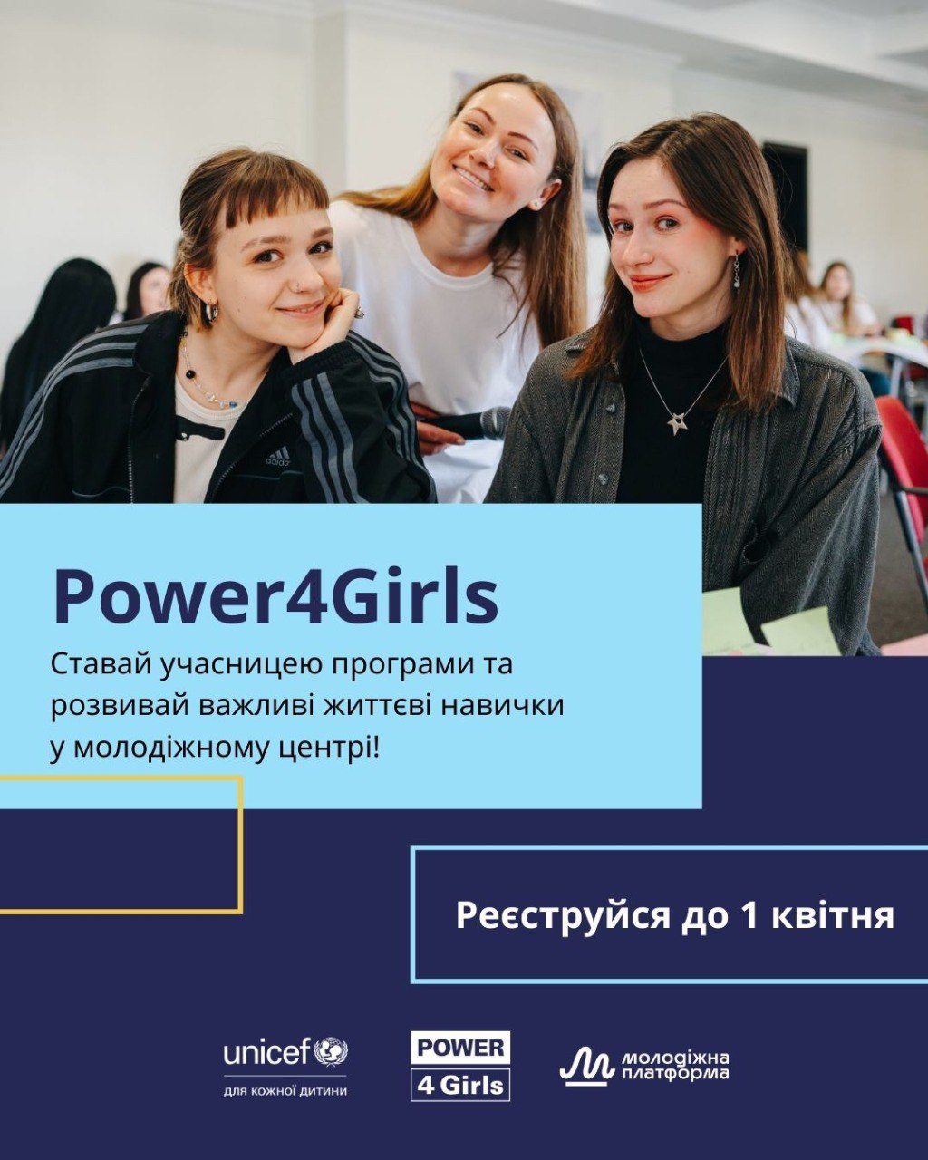 Проєкт “Power4Girls: програма розвитку для дівчат у молодіжних центрах” реалізується за сприяння UNICEF Ukraine неприбутковою організацією “Молодіжна Платформа” (ГО “Молодіжна Платформа”). Це чудова ініціатива, яка підтримує молодь.