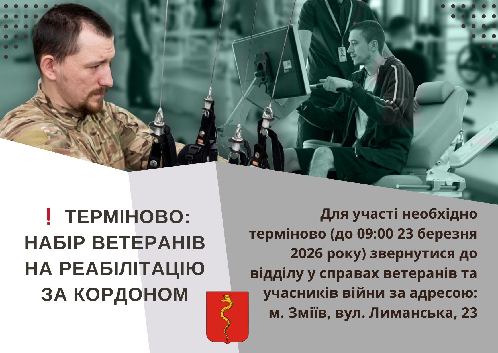 Відділ у справах ветеранів та учасників війни управління соціального захисту населення Зміївської міської ради інформує про важливу можливість для наших захисників. На виконання листа Управління у справах ветеранів Харківської обласної військової адміністрації від 20.03.2026 року триває формування списків кандидатів для проходження реабілітації за кордоном. Це чудова новина для тих, хто потребує відновлення та підтримки після служби.