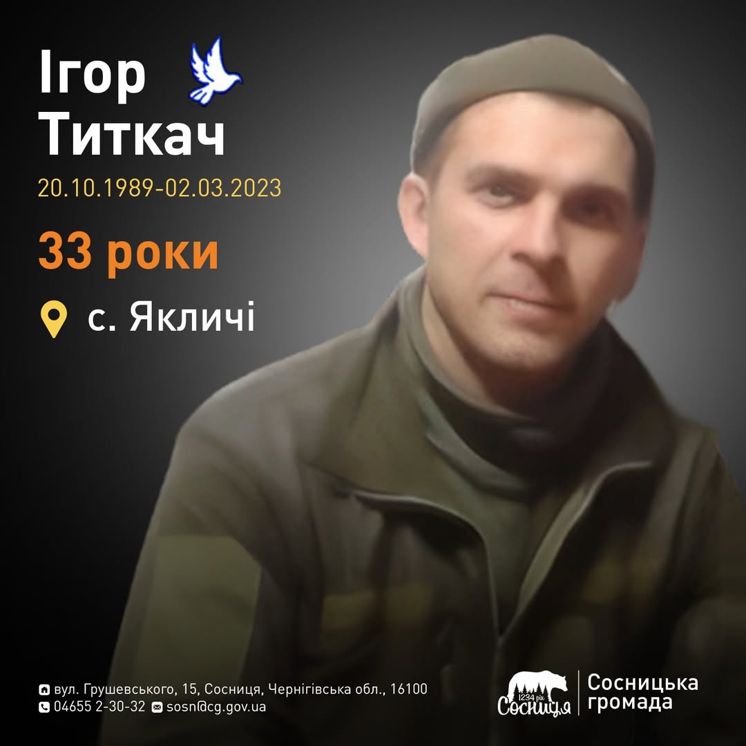 Історія життя та подвигу Ігоря Титкача, уродженця села Спаське на Сосниччині, який віддав своє життя за свободу України. Його шлях, розпочатий 20 жовтня 1989 року, обірвався трагічно 2 березня 2023 року під час виконання бойового завдання поблизу Луганщини. Ігор Титкач, мешканець села Якличі, залишив глибокий слід у серцях тих, хто його знав, та в історії боротьби за незалежність нашої держави.