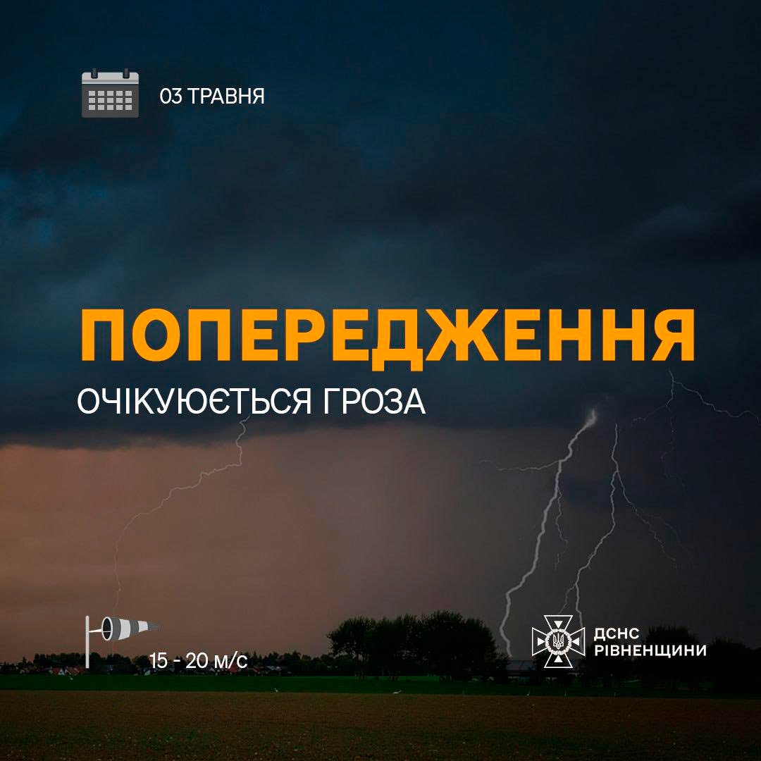 За інформацією Рівненського обласного центру з гідрометеорології, вранці та вдень 03 травня в м. Рівне та області очікуються грози, місцями шквали 15-20 м/с. Будьте обережні та слідкуйте за оновленнями!