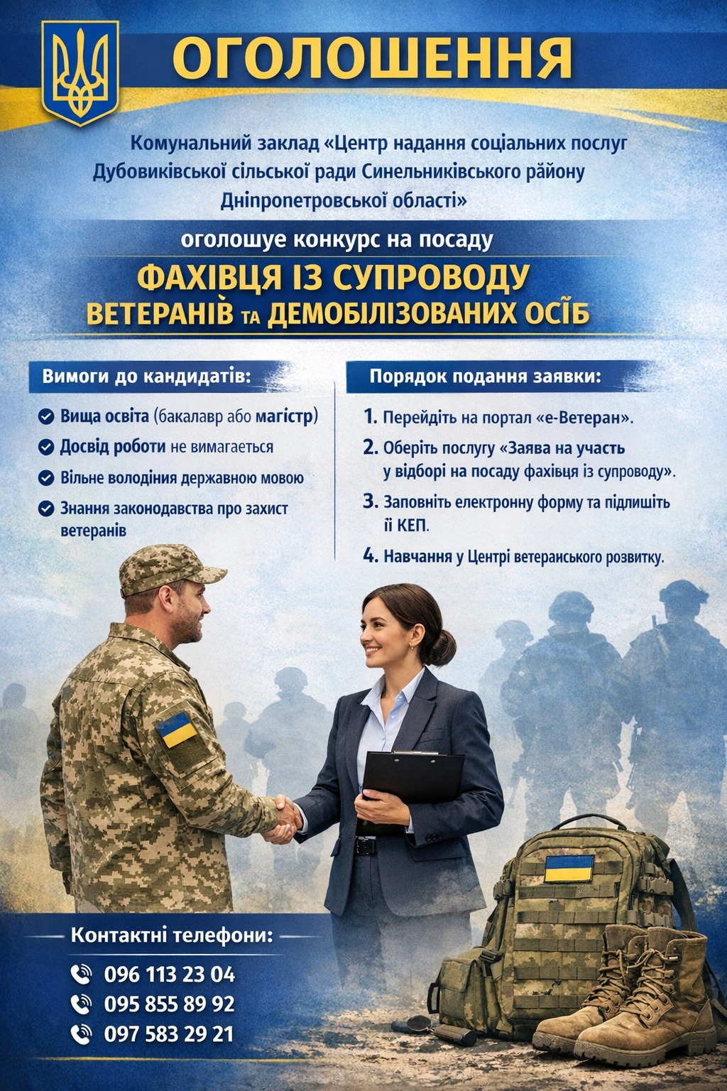 Комунальний заклад «Центр надання соціальних послуг Дубовиківської сільської ради Синельниківського району Дніпропетровської області» оголошує конкурс на участь у відборі кандидатів на посаду фахівця із супроводу ветеранів та демобілізованих осіб.