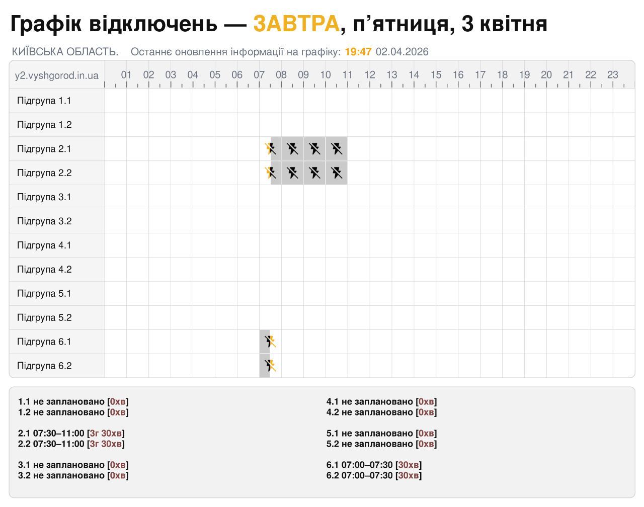 Завтра, 3 КВІТНЯ, в усіх регіонах України з 06:00 до 22:00 будуть застосовуватись ГРАФІКИ ОБМЕЖЕННЯ ПОТУЖНОСТІ (для промислових споживачів), а з 07:00 до 11:00 – діятимуть ГРАФІКИ ПОГОДИННИХ ВІДКЛЮЧЕНЬ (для всіх категорій споживачів)