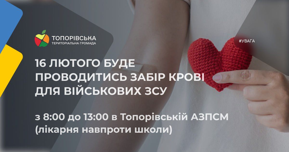 ‼️Важлива подія для Топорівської громади: 16 лютого з 8:00 до 13:00 в приміщенні Топорівської АЗПСМ (лікарня навпроти школи) відбудеться виїзна акція зі забору крові для потреб наших військових Збройних Сил України. Закликаємо кожного небайдужого мешканця долучитися до цієї надзвичайно важливої місії – стати донором крові для українських Захисників і Захисниць. Ваша кров – це неоціненна допомога та реальний шанс на порятунок життя для тих, хто щодня ризикує власним здоров’ям, боронячи нашу державу. У госпіталях постійно є потреба в донорській крові для поранених бійців.