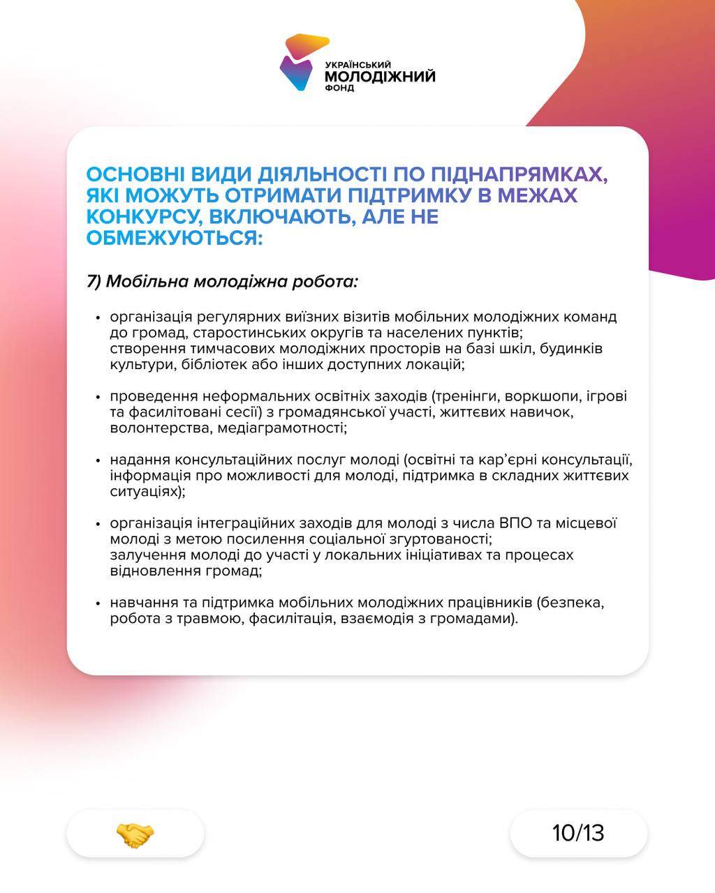 ✨ Український молодіжний фонд (УМФ) оголошує унікальний конкурс для активних громадян, які працюють з молоддю та прагнуть втілити власні інноваційні ідеї у своїх громадах. Це чудова нагода для тих, хто щодня надихає, навчає, підтримує та залучає молодь до суспільно важливих процесів.