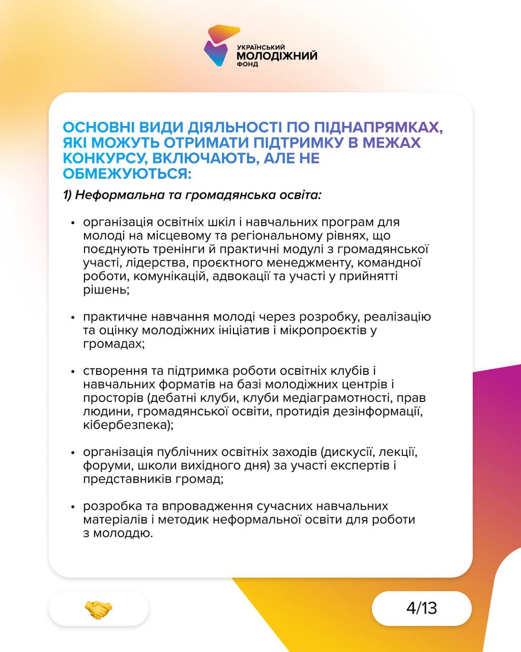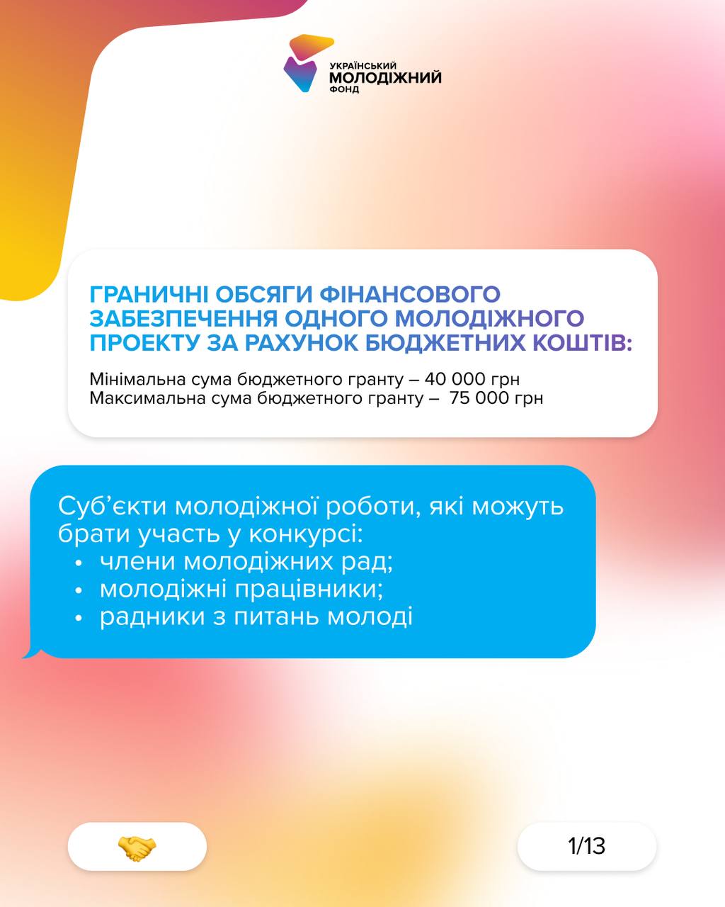 Цей конкурс спрямований на підтримку фізичних осіб, які прагнуть втілити свої ідеї в життя та посилити позитивні зміни в українських громадах. Якщо ви активно працюєте з молоддю, цей конкурс саме для вас.