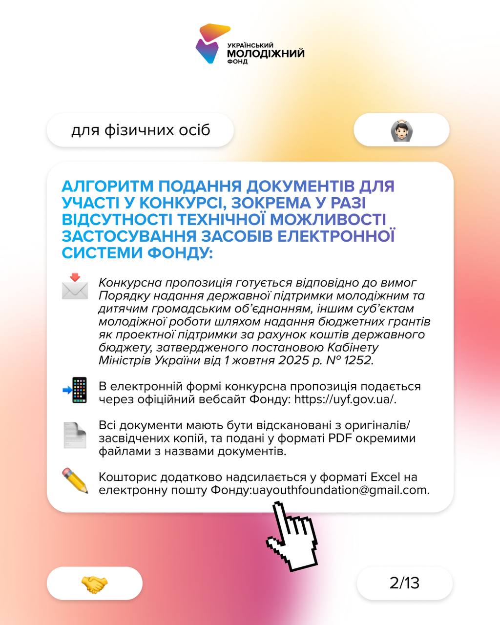 Для участі в конкурсі необхідно заповнити та завантажити всі необхідні документи у форматі PDF через офіційний вебсайт Фонду: uyf.gov.ua. Кошторис проєкту в форматі Excel слід надіслати окремо на електронну пошту: [email protected].