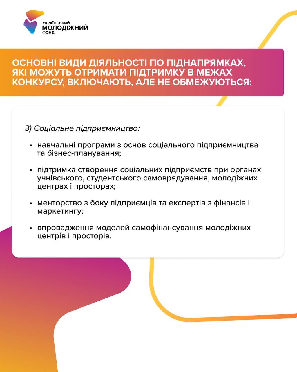 Фінансування доступне для освітніх програм, що навчають основам підприємництва, підтримки створення молодіжних соціальних ініціатив на базі молодіжних центрів, організації менторських програм за участі успішних підприємців, а також для впровадження ефективних моделей самофінансування молодіжних проєктів. Розвиток соціального підприємництва є одним із пріоритетів.