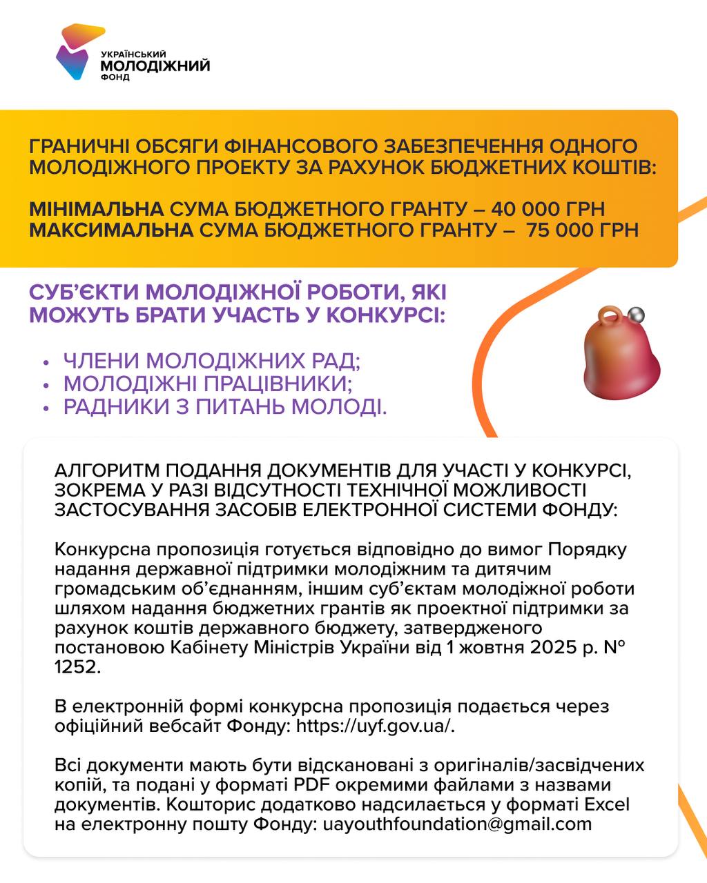Пропозиції приймаються через офіційний вебсайт Українського молодіжного фонду: https://uyf.gov.ua/programs/ekonomichna-spromozhnist-fo