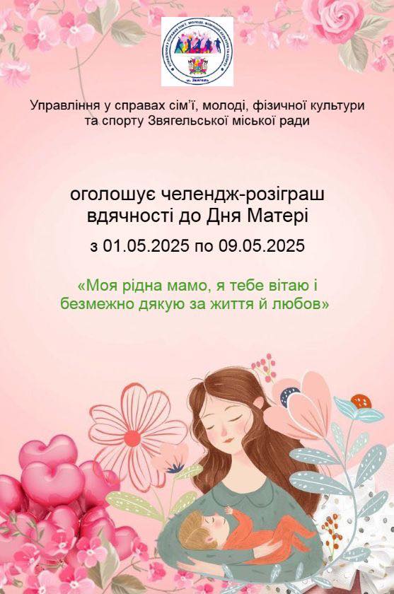 Управління у справах сім’ї, молоді, фізичної культури та спорту Звягельської міської ради оголошує челендж-розіграш вдячності до Дня Матері «Моя рідна мамо, я тебе вітаю і безмежно дякую за життя й любов» у месенджері Instagram.