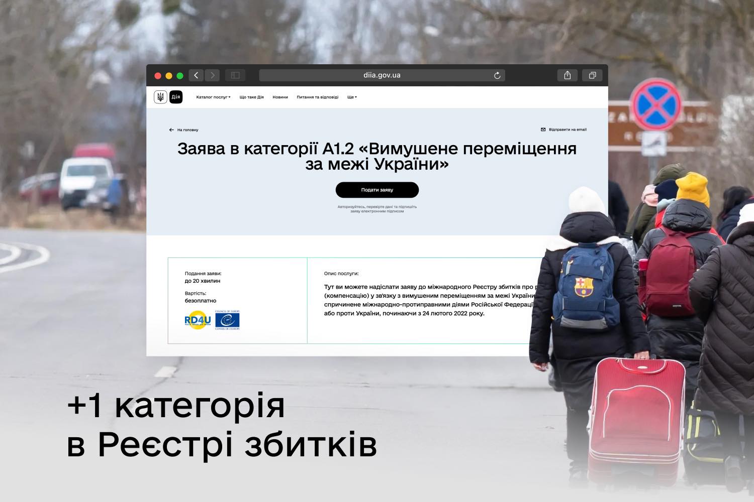 Відкрито нову категорію в Реєстрі збитків через Дію: A1.2 «Вимушене переміщення за межі України». Ця ініціатива дозволяє українцям, які були змушені покинути свої домівки після 24 лютого 2022 року через російську агресію, подати заяву на отримання компенсації. Це важливий крок для фіксації збитків, завданих громадянам України, та збору доказів воєнних злочинів Російської Федерації.