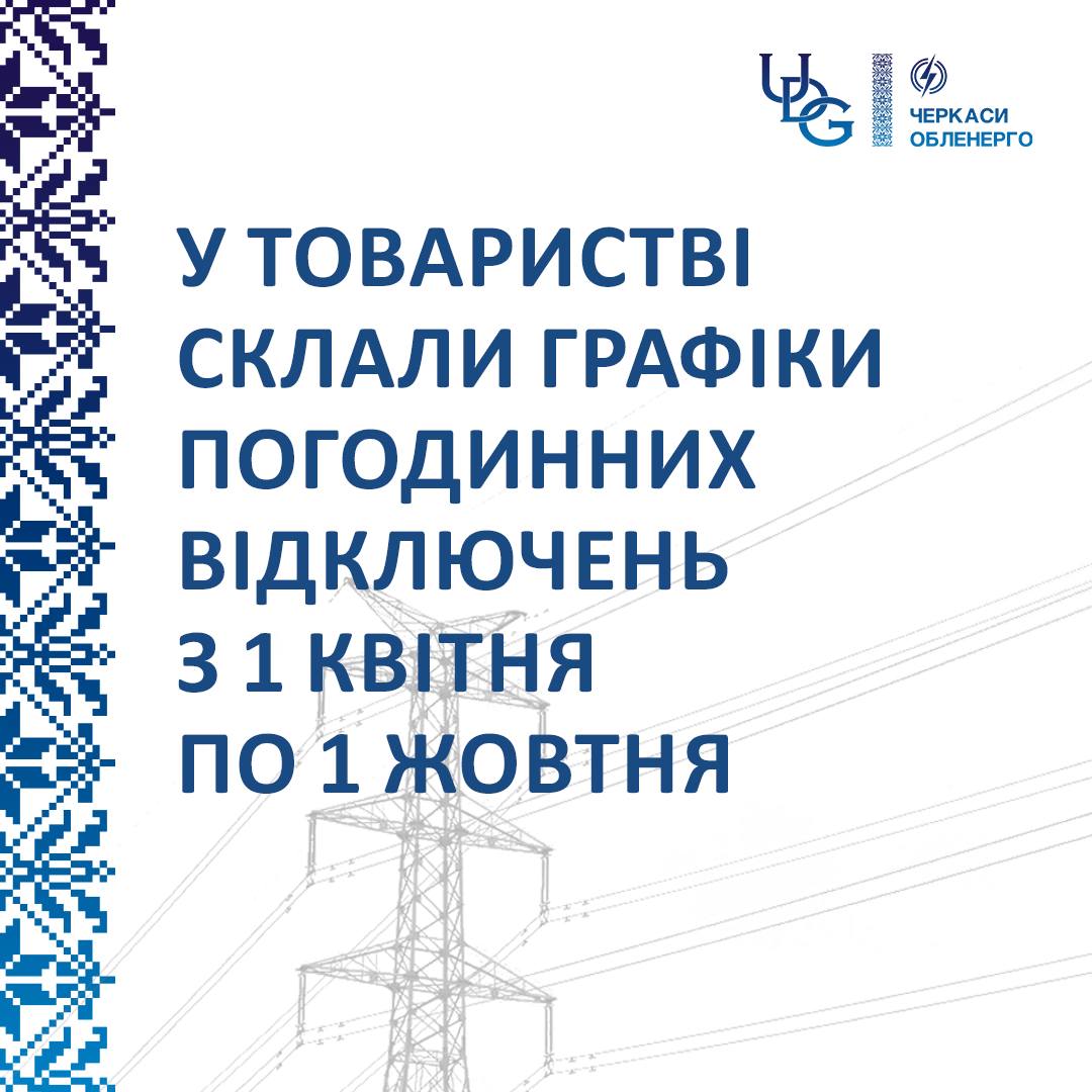 ❗ Фахівці АТ «ЧЕРКАСИОБЛЕНЕРГО» відповідно до вимог законодавства розробили графіки погодинних відключень, які діятимуть з 1 квітня по 1 жовтня 2026 року. Просимо всіх ознайомитися з оновленою інформацією.