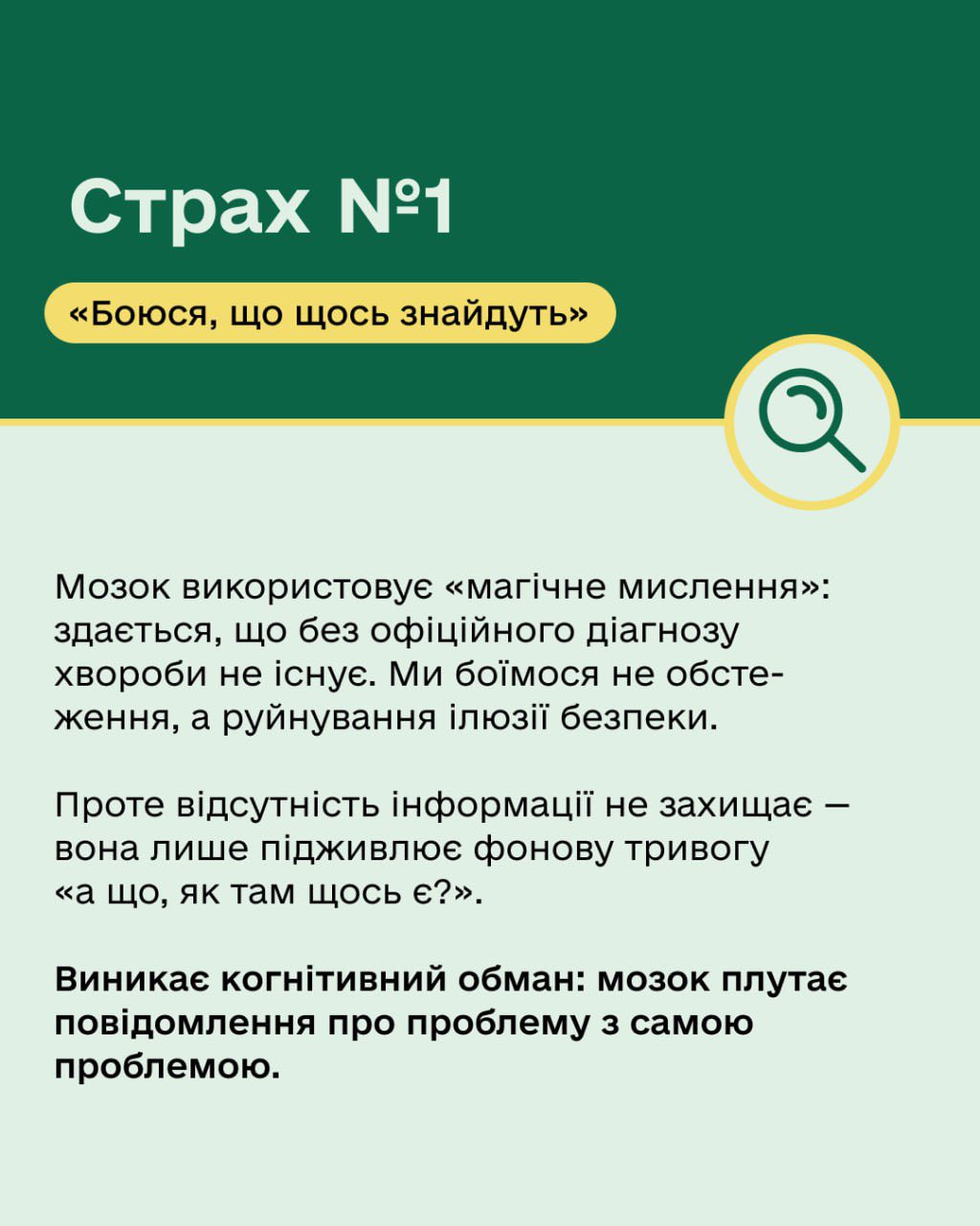 Міністерство охорони здоров’я України, разом із досвідченою психіатринею та психотерапевткою Марією Черкасовою, проаналізувало три найпоширеніші страхи, які найчастіше стають на заваді своєчасним медичним оглядам. Було підготовлено фахові рекомендації, як ефективно подолати ці психологічні бар’єри та зробити процес проходження обстежень менш тривожним.