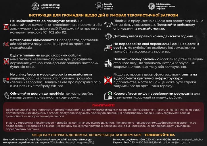 Центр протидії дезінформації спільно зі Службою безпеки України та МВС України розробили для громадян надважливу інструкцію щодо дій в умовах терористичної загрози. Цей документ покликаний допомогти кожному вчасно розпізнати потенційну небезпеку та ефективно захистити себе та своїх близьких. Розуміння правил поведінки під час терористичної загрози є критично важливим для забезпечення особистої безпеки та безпеки оточуючих.