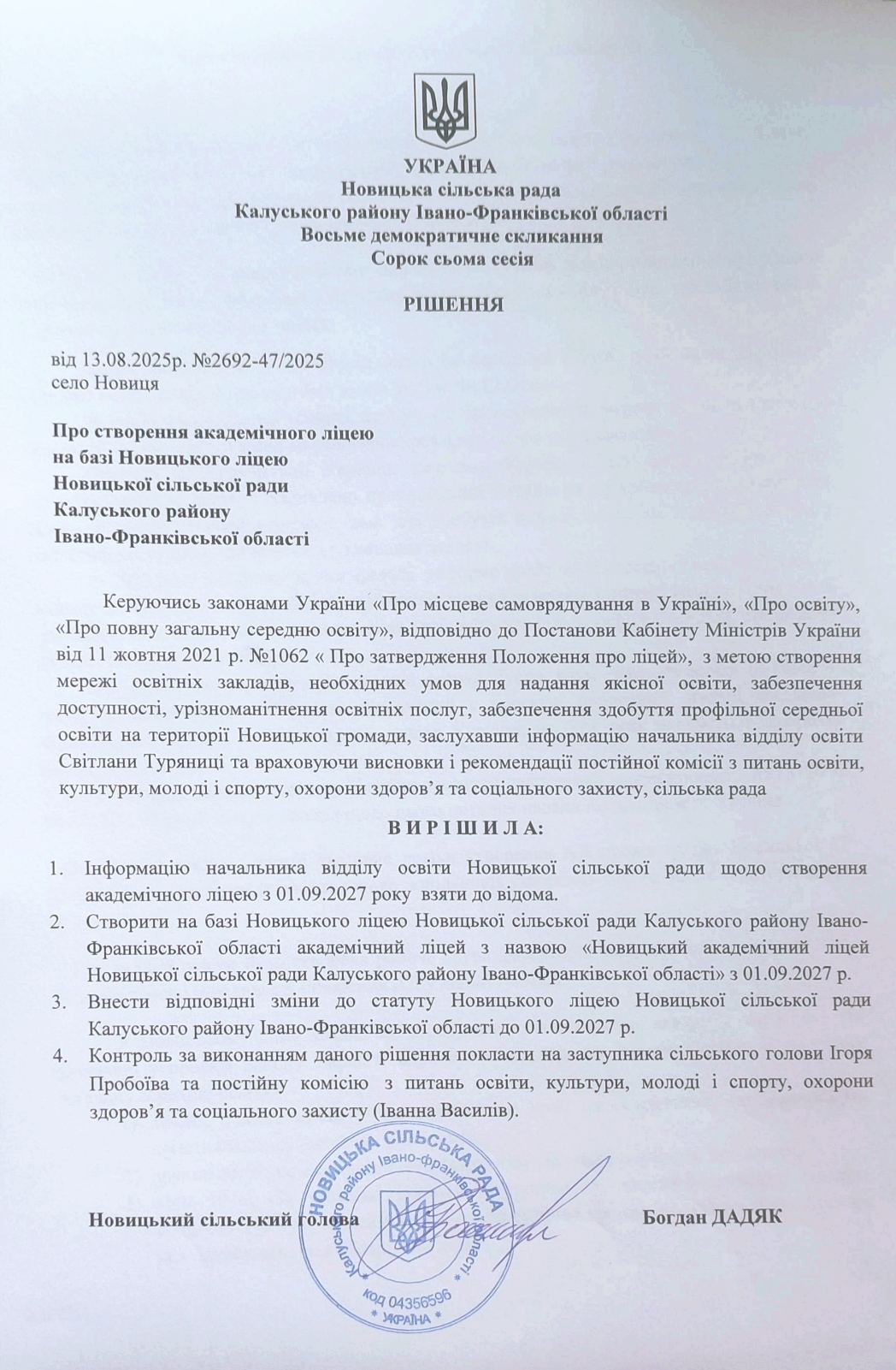 Кожна дитина повинна мати можливість здобути повну загальну середню освіту, причому заклад має бути максимально доступним до місця її проживання. У Новицькій громаді близько 1300 дітей навчаються у 4 гімназіях та 4 ліцеях. Враховуючи заплановані урядом освітні зміни, 13 серпня 2025 року Новицька сільська рада ухвалила рішення про створення академічного ліцею на базі Новицького ліцею.