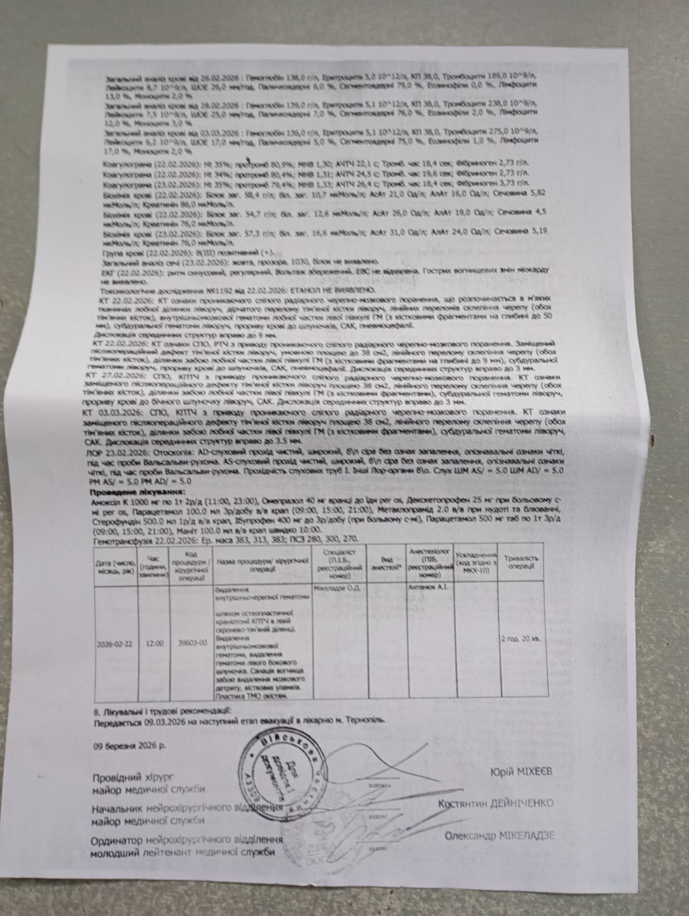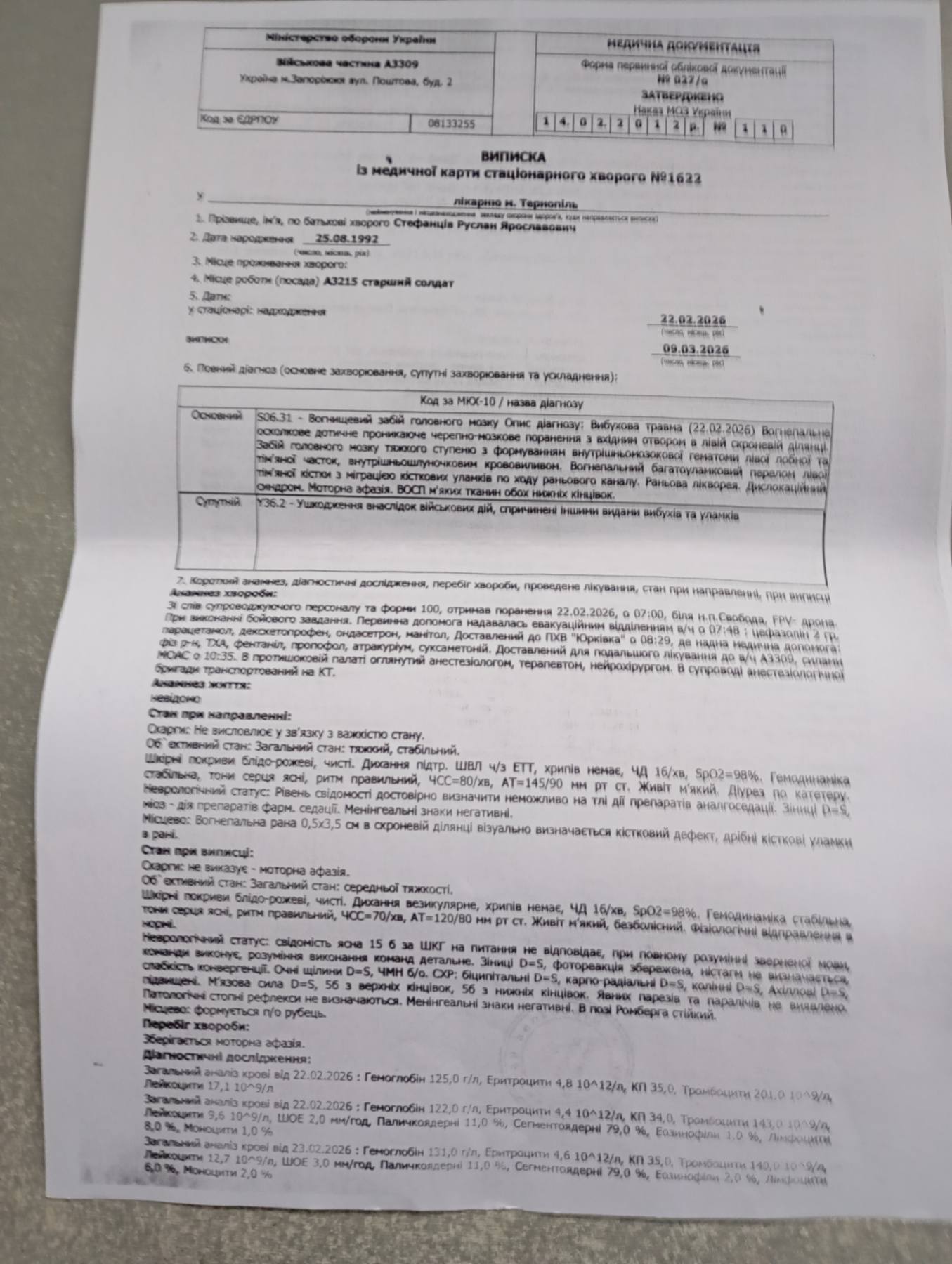 Руслан Стефанців вже пройшов необхідну операцію з видалення уламків з голови. Його було успішно перевезено із Запоріжжя до Тернополя, де він зараз перебуває під пильним наглядом медичних фахівців. Стан Руслана стабілізувався, що є доброю новиною, проте попереду на нього чекає тривалий і складний шлях відновлення та реабілітації.