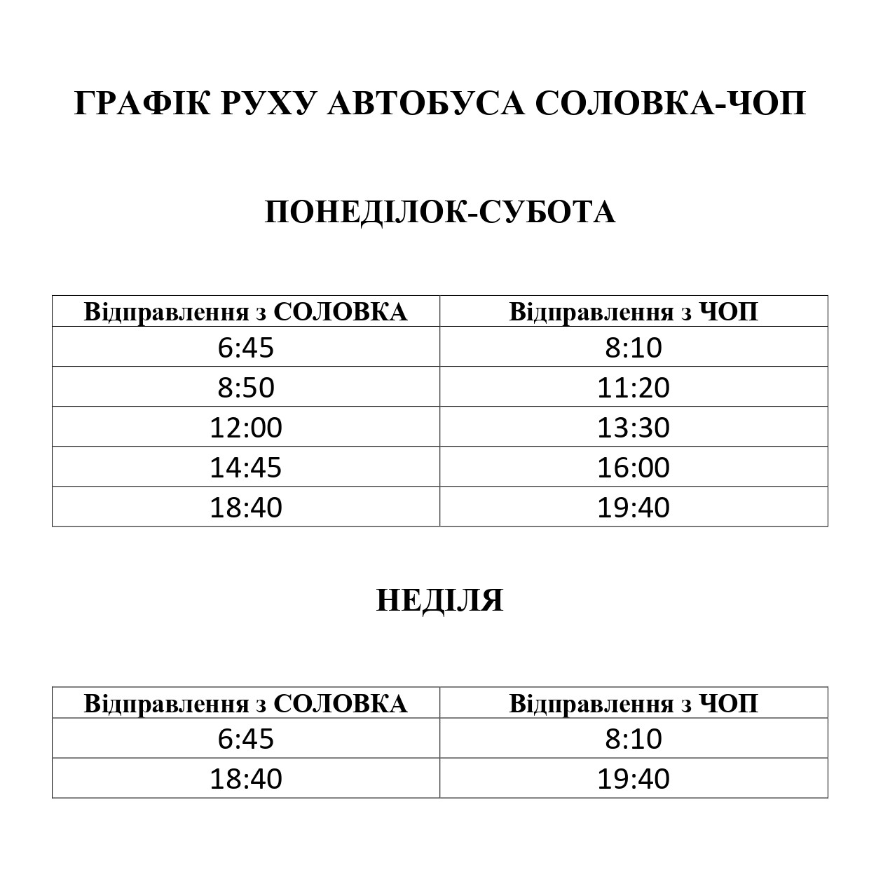 Наразі ми раді повідомити, що отримали та готові представити графік руху автобуса за маршрутом Соловка – Чоп. Цей графік допоможе вам планувати свої поїздки.