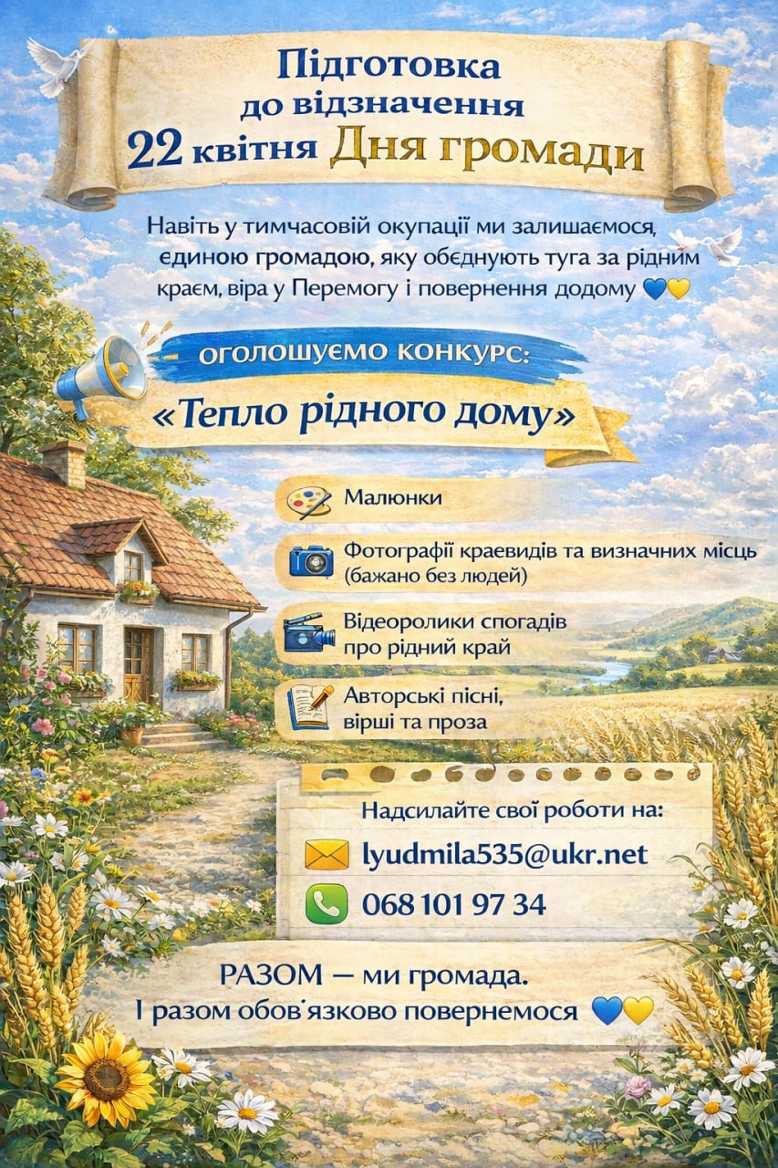Сьогодні наша громада переживає непрості часи: територія тимчасово окупована, багато жителів змушені були залишити свої домівки та знайшли прихисток у різних куточках України й за кордоном. Незважаючи на всі виклики, ми продовжуємо працювати задля підтримки кожного земляка. Навіть на відстані ми залишаємося згуртованими, допомагаємо один одному, поки ми пам’ятаємо одне одного та зберігаємо нашу ідентичність — наша громада живе, попри всі намагання ворога її знищити. Наша єдність сьогодні — це гарантія відновлення нашої громади завтра. Разом ми вистоїмо. Разом ми повернемося.