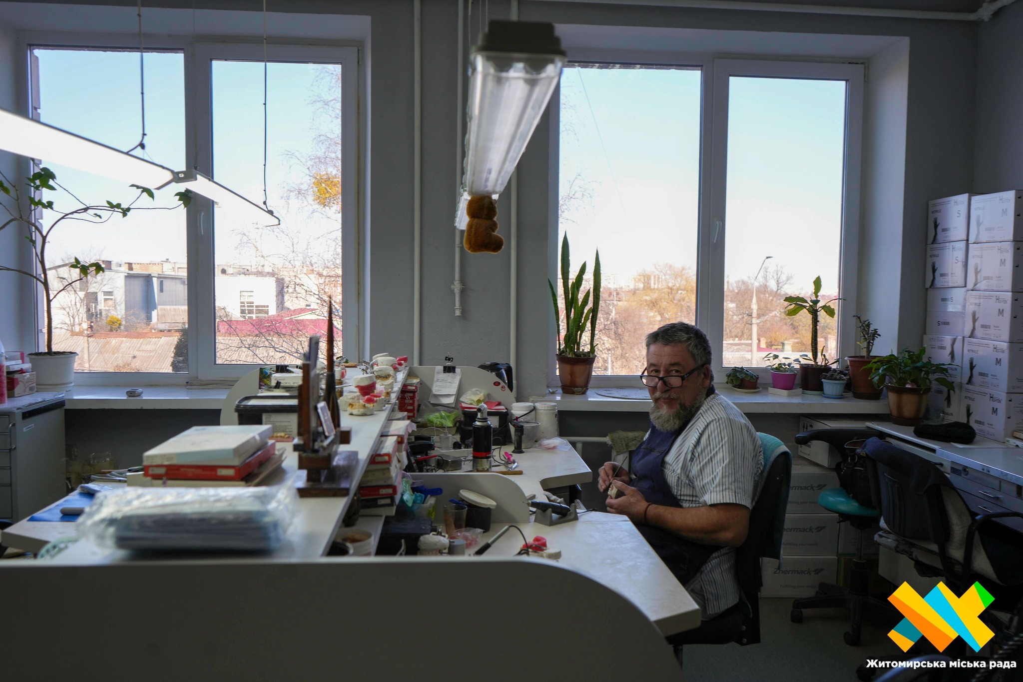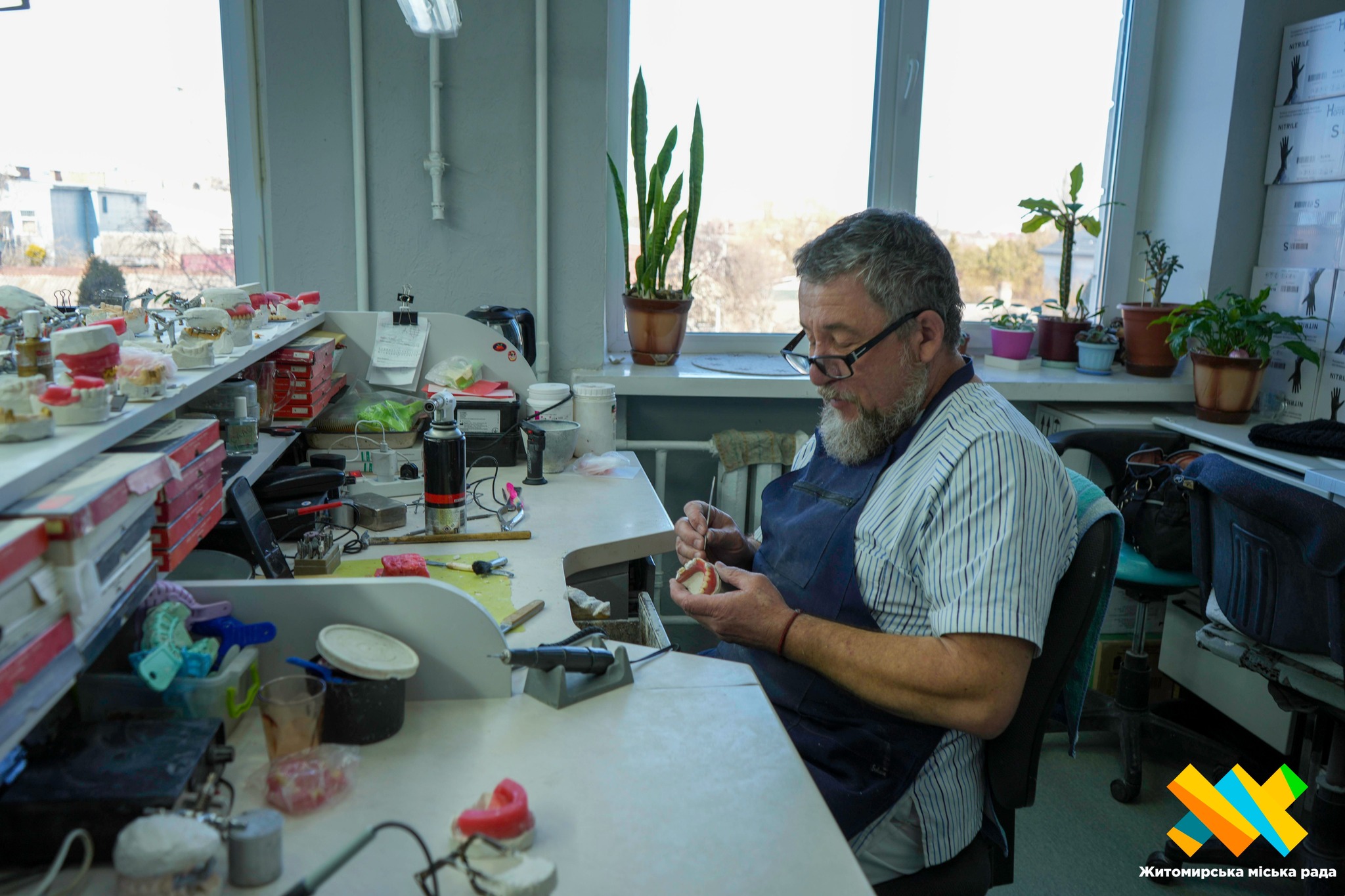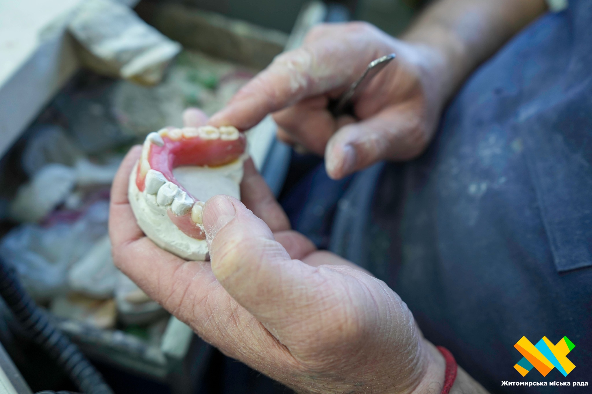 За роботою — зубний технік із 30-річним досвідом роботи саме в цій комунальній поліклініці, Микола Яковенко. Він зосереджено моделює наступний протез.