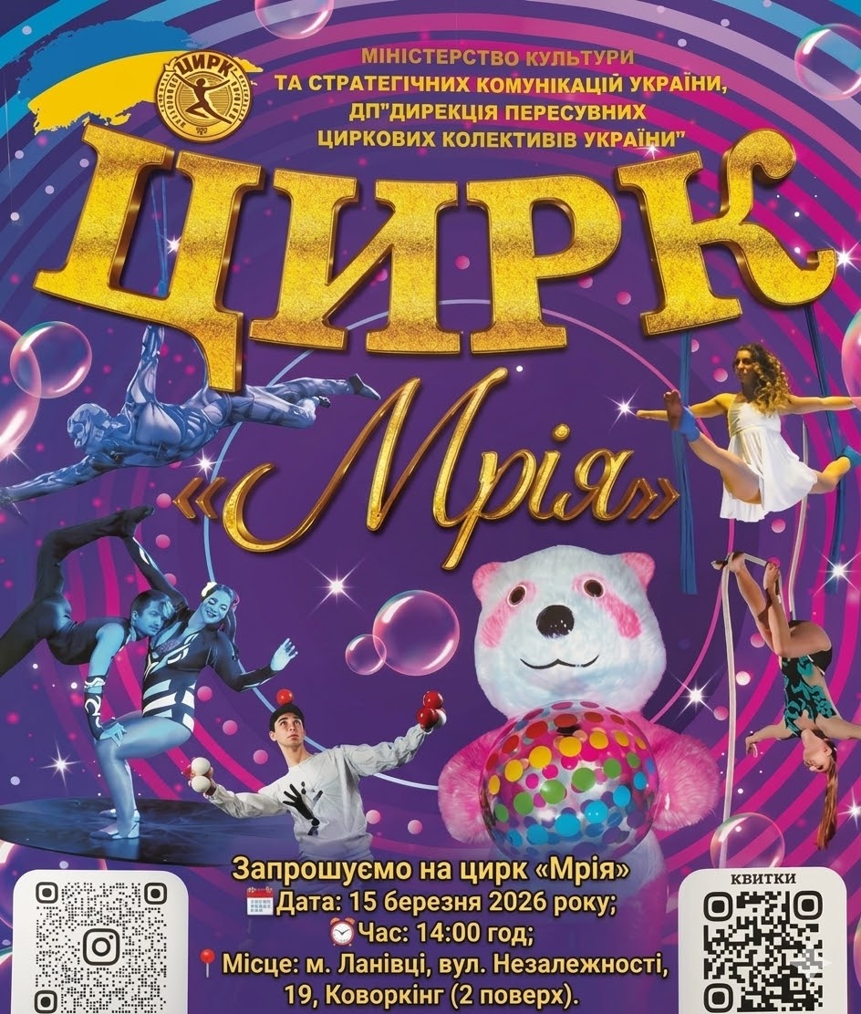 🌈 Запрошуємо маленьких мешканців Лановецької громади на чарівну виставу «Мрія»! Це яскрава, весела та неймовірно захоплива подія, яка подарує дітям море позитивних емоцій, щирі посмішки та незабутні враження. «Мрія» — це не просто вистава, це справжня подорож у світ казок та фантазій, де кожен маленький глядач зможе знайти щось особливе для себе. Ми підготували для вас безліч сюрпризів, інтерактивних елементів та яскравих моментів, які надовго залишаться у вашій пам’яті. Цей захід є чудовою нагодою провести час усією родиною, відволіктися від буденності та зануритися в атмосферу справжнього свята.