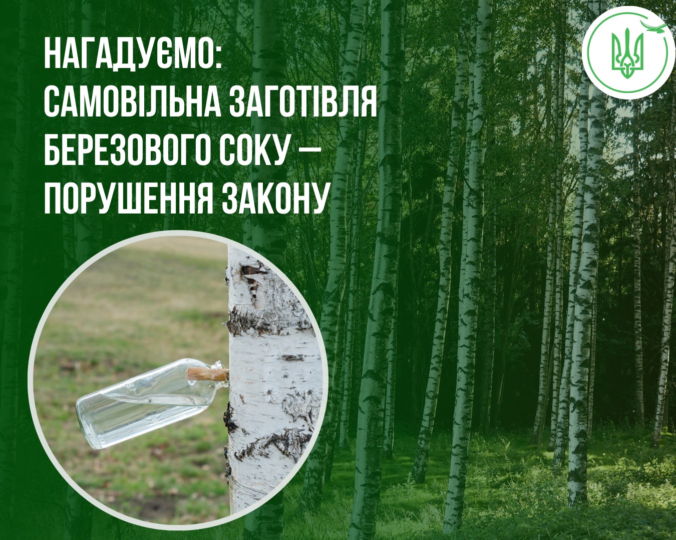 ◾ Окремо звертаємо увагу, що в межах населених пунктів добування березового соку з дерев є порушенням Правил утримання зелених насаджень у населених пунктах. Це може негативно вплинути на стан міських дерев, призвести до пошкодження кори, розвитку грибкових захворювань та їх поступового всихання. Такі дії порушують благоустрій населених пунктів, за що передбачена адміністративна відповідальність за ст. 152 КУпАП.