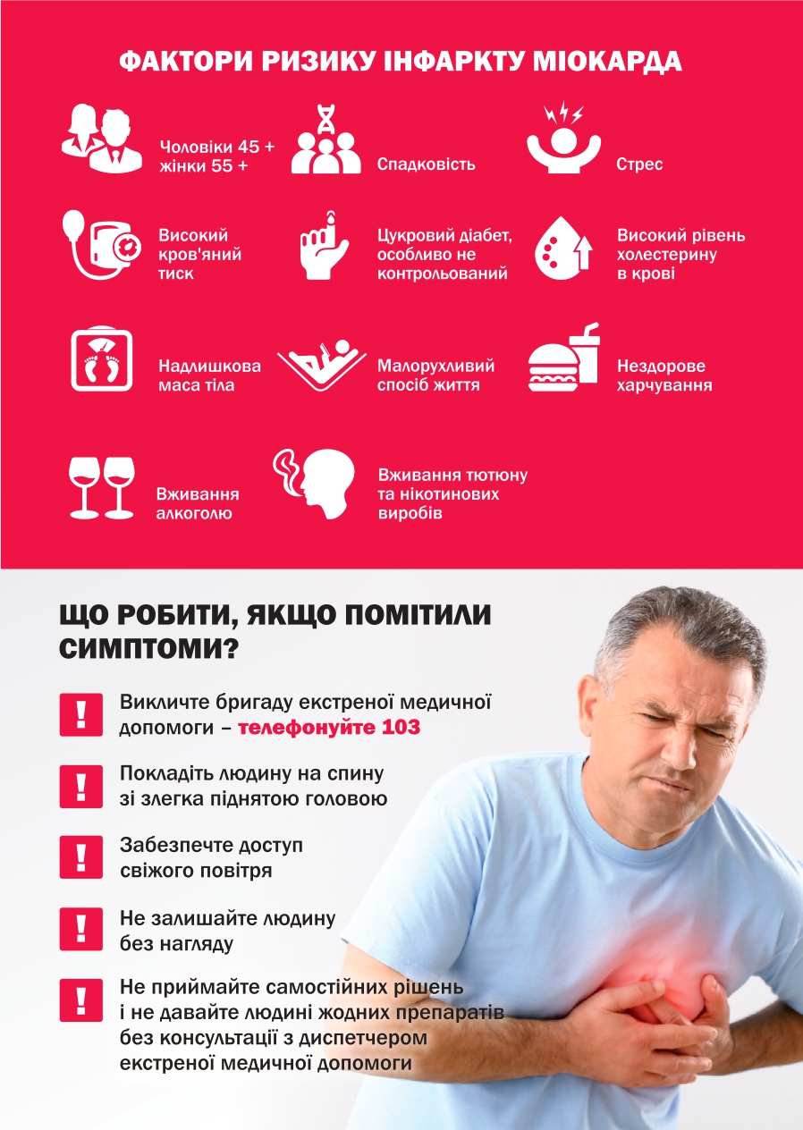 Якщо ви або хтось поруч відчуває симптоми, схожі на інфаркт міокарда, дійте негайно: