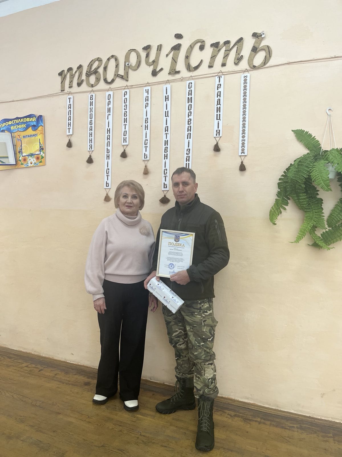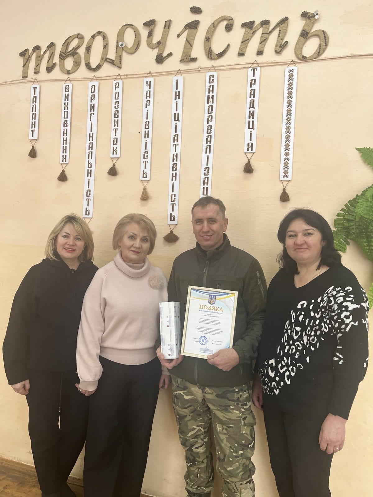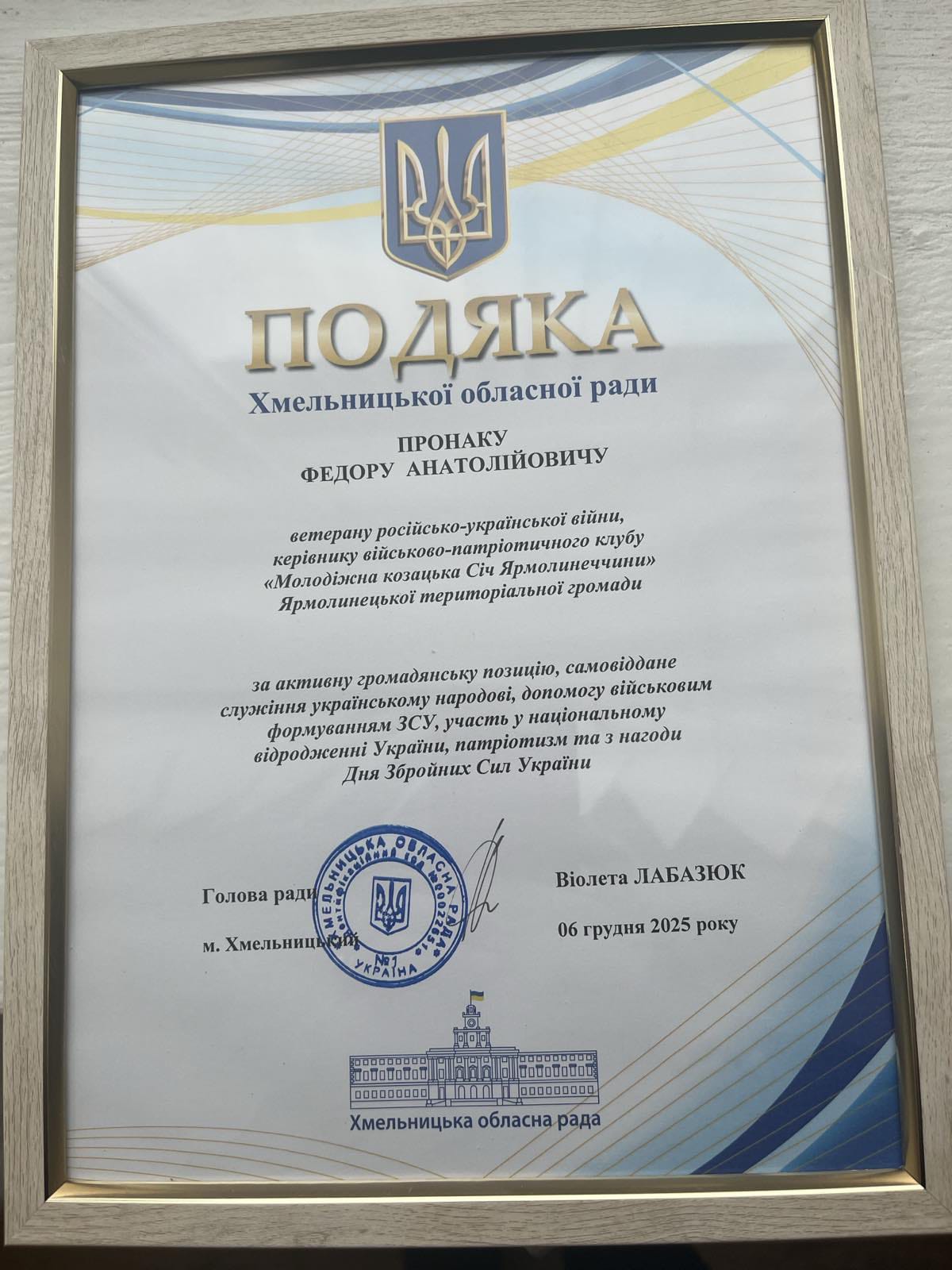 Надія Орловська, заступник голови комісії з роботи з молоддю, методист науково-методичного центру виховної роботи Хмельницького обласного інституту післядипломної педагогічної освіти імені Анатолія Назаренка, вручила Федору Анатолійовичу подяку Хмельницької обласної ради за активну громадянську позицію, самовіддане служіння українському народові, допомогу військовим формуванням Збройних Сил України, участь у національному відродженні України, патріотизм та з нагоди Дня Збройних сил України.