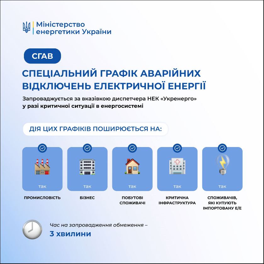 Важливо: Оскільки ці заходи є екстреними, заздалегідь попередити споживачів про точний час та тривалість знеструмлення при застосуванні ГАВ і СГАВ неможливо.