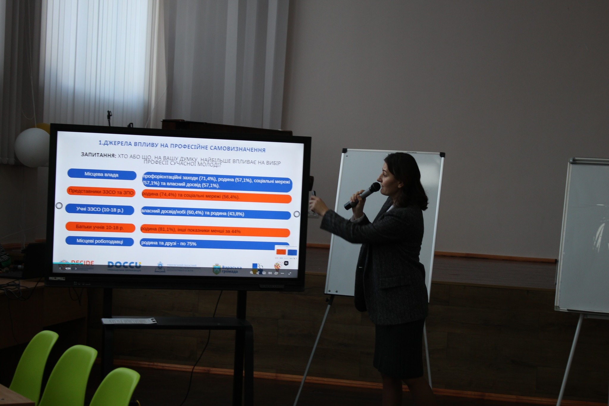 Під час заходу регіональний координатор проекту Сергій Скоропляс та ментор Мар’яна Соловей представили проєкт, спрямований на формування системного підходу до профорієнтаційної роботи в закладах освіти.